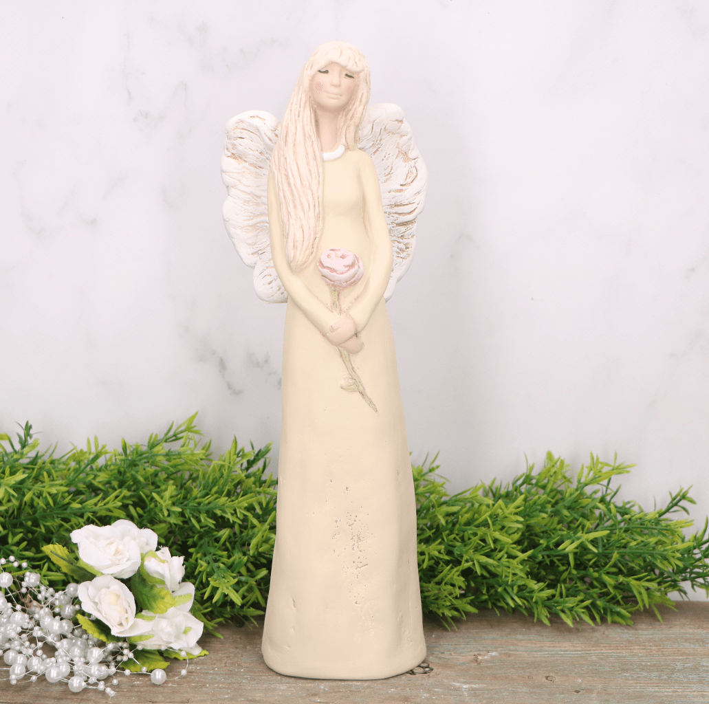 Anioł aniołek gipsowy z różą kremowy 31cm