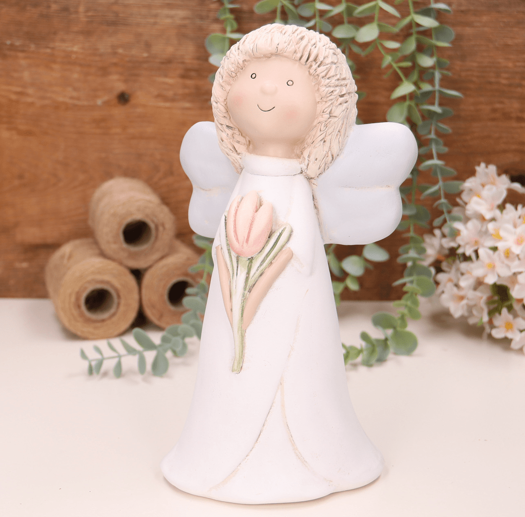 Aniołek dziewczynka z tulipanem szare skrzydła 25cm