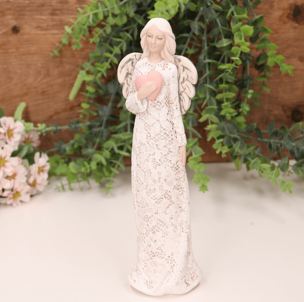 Aniołek ślubny w zdobionej sukni z sercem biały 25cm