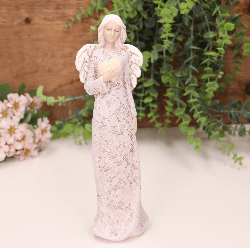 Aniołek ślubny w zdobionej sukni z sercem fioletowy 25cm