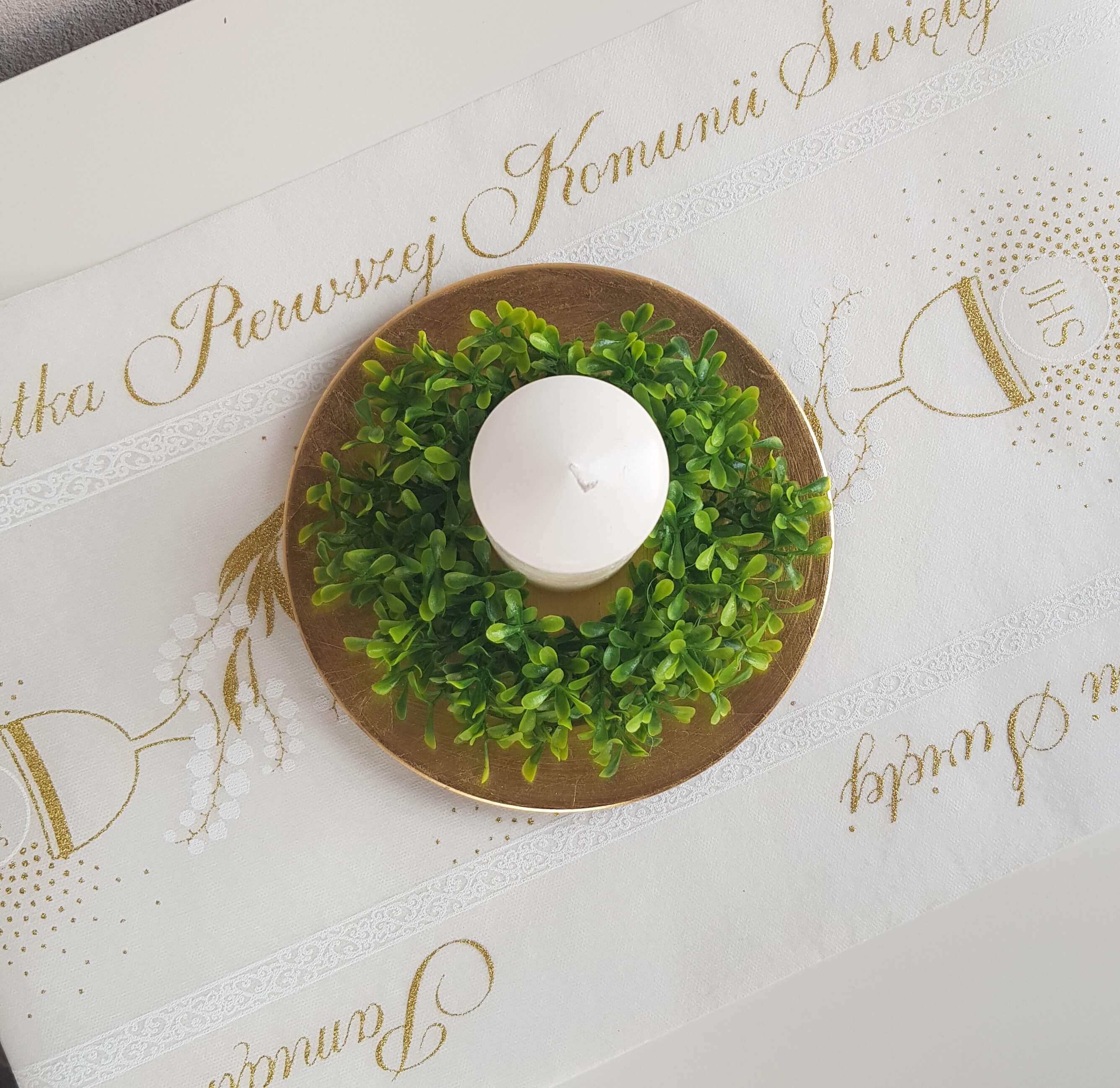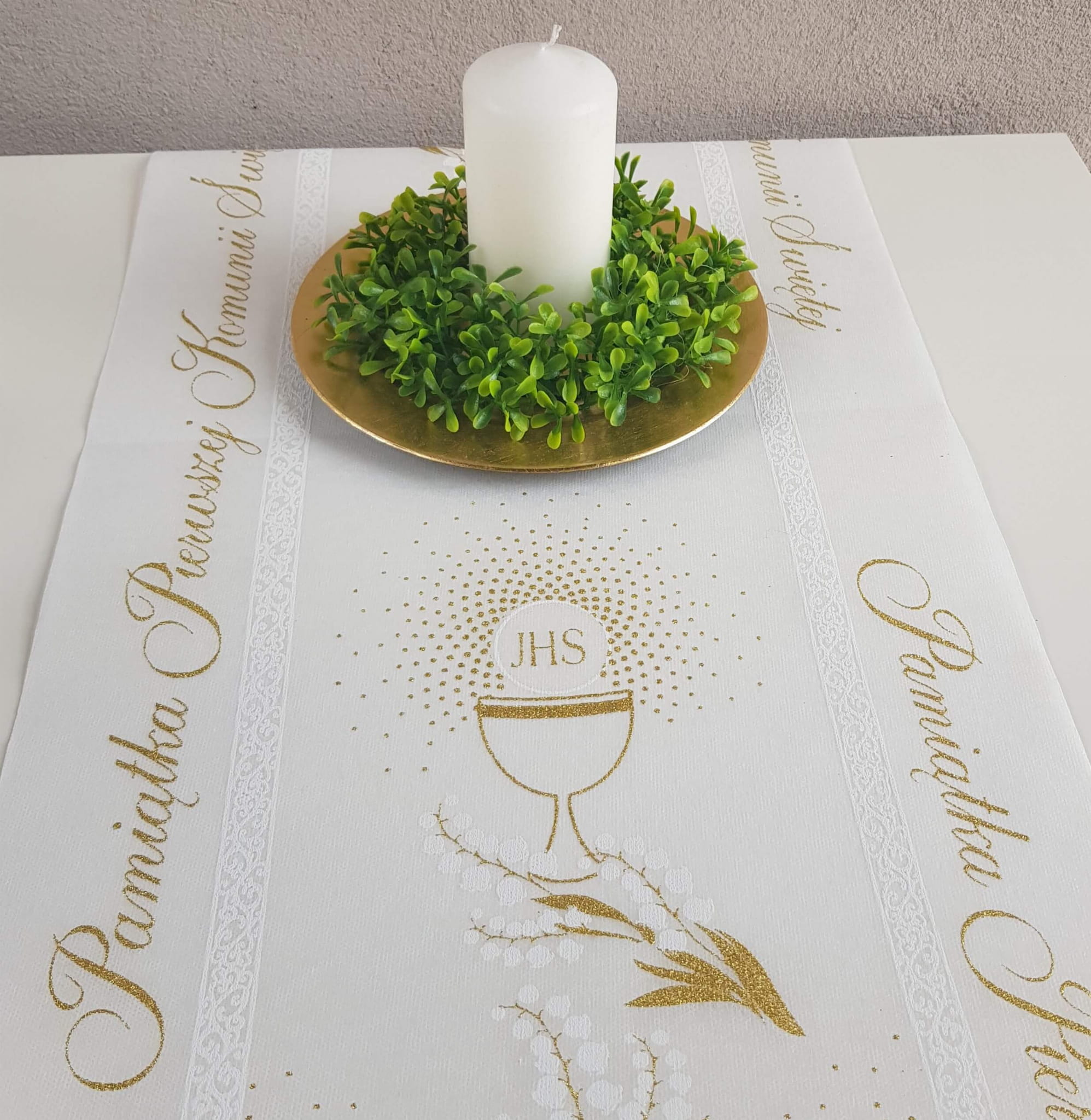Bieżnik wykonany z flizeliny z motywem komunijnym. Biało-złota kolorystyka oraz popularny motyw opłatka i hostii oczaruje najbliższych i pozwoli stworzyć bazę do przygotowania całej aranżacji na Komunii dziecka. Bieżnik przygotowany specjalnie na Komunię to wyjątkowa dekoracja stołu.
