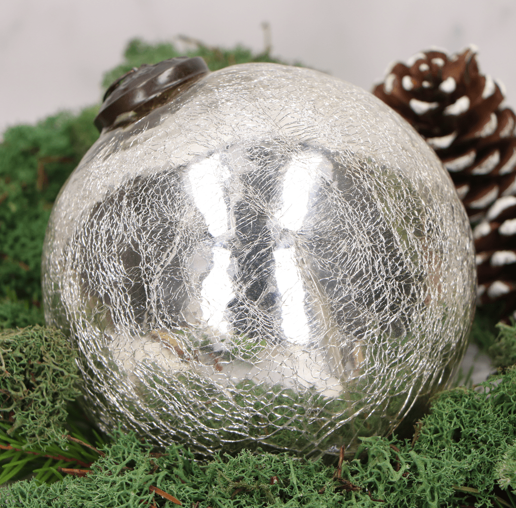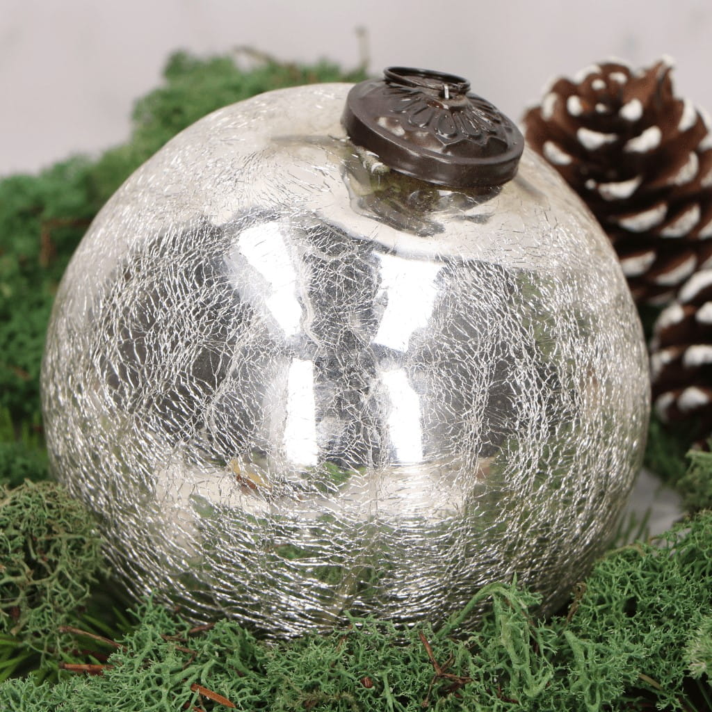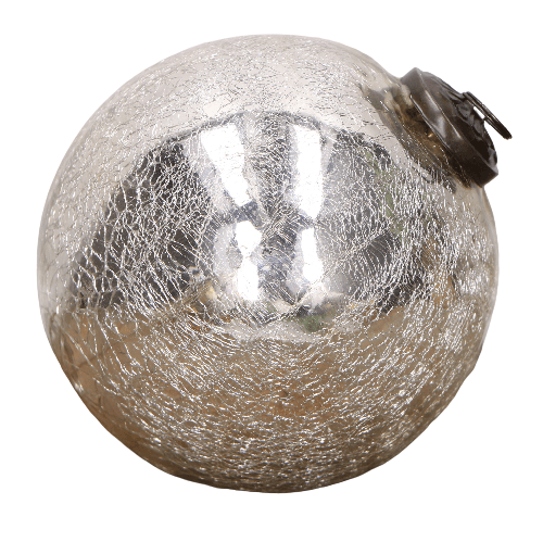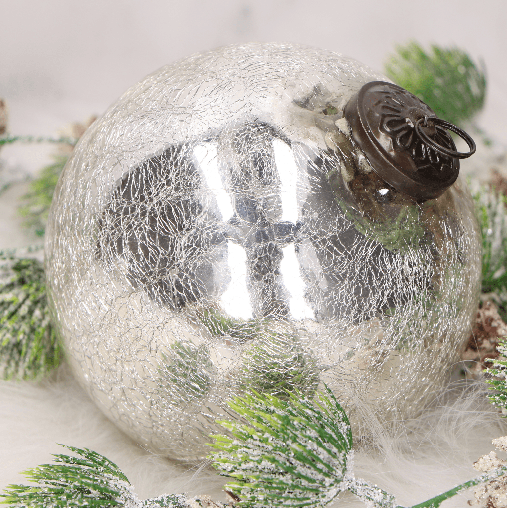 Przepiękna bombka w srebrnej kolorystyce z tradycyjnym wzorem. Bombka posiada wyjątkowe pęknięcia. Bombki dekorowane w srebrnej kolorystyce to propozycja pasująca zarówno do nowoczesnych aranżacji w stylu glamour jak i do tradycyjnej dekoracji świątecznej.