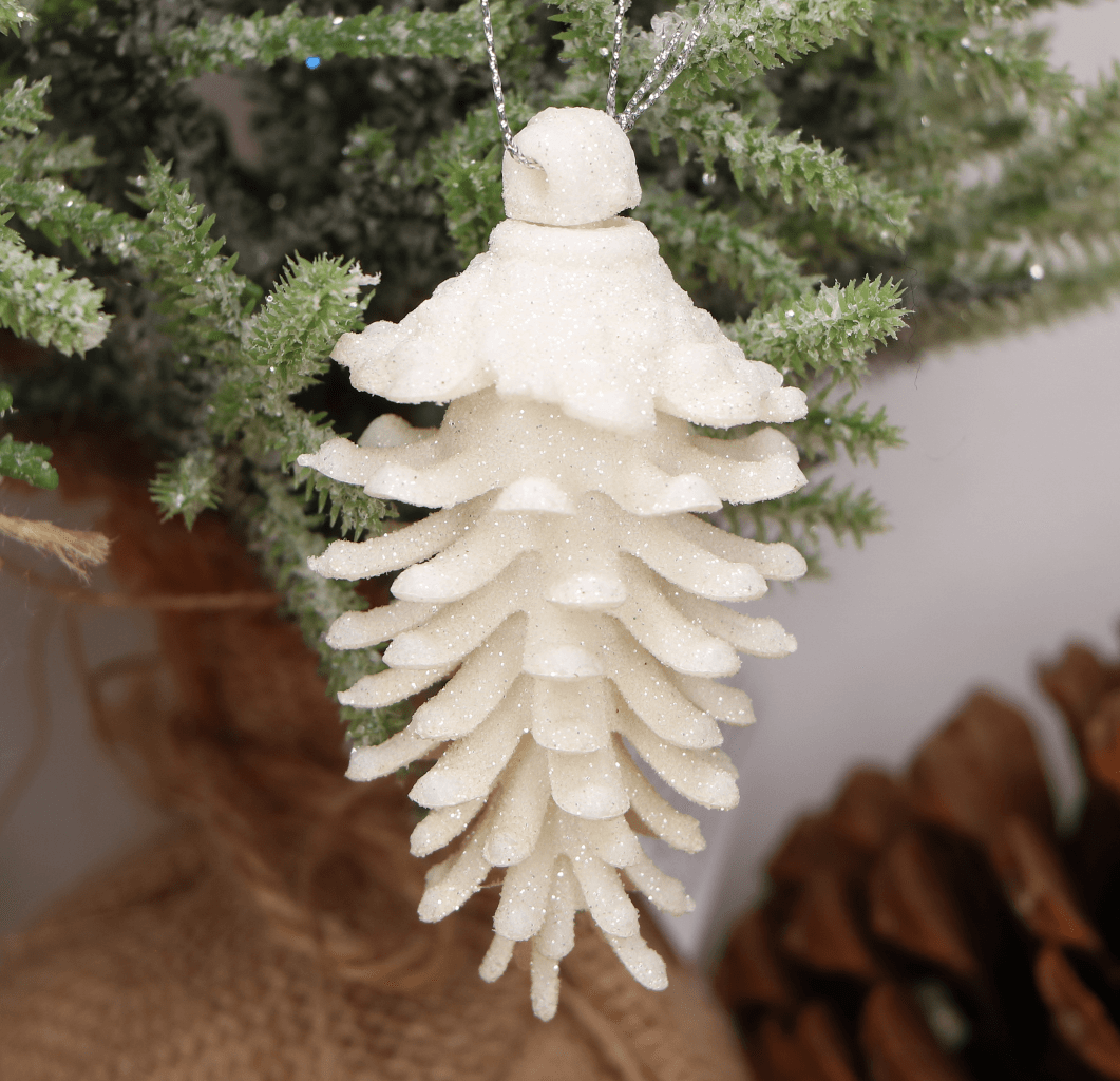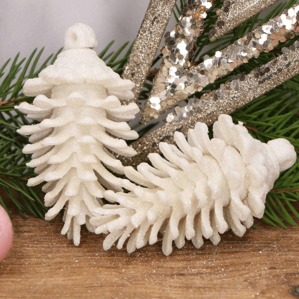 Zawieszki brokatowe na choinkę plastikowe szyszki białe 2szt.