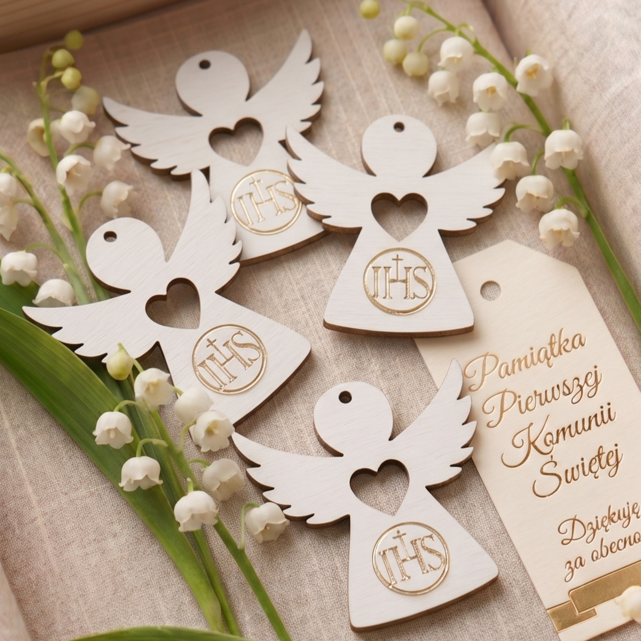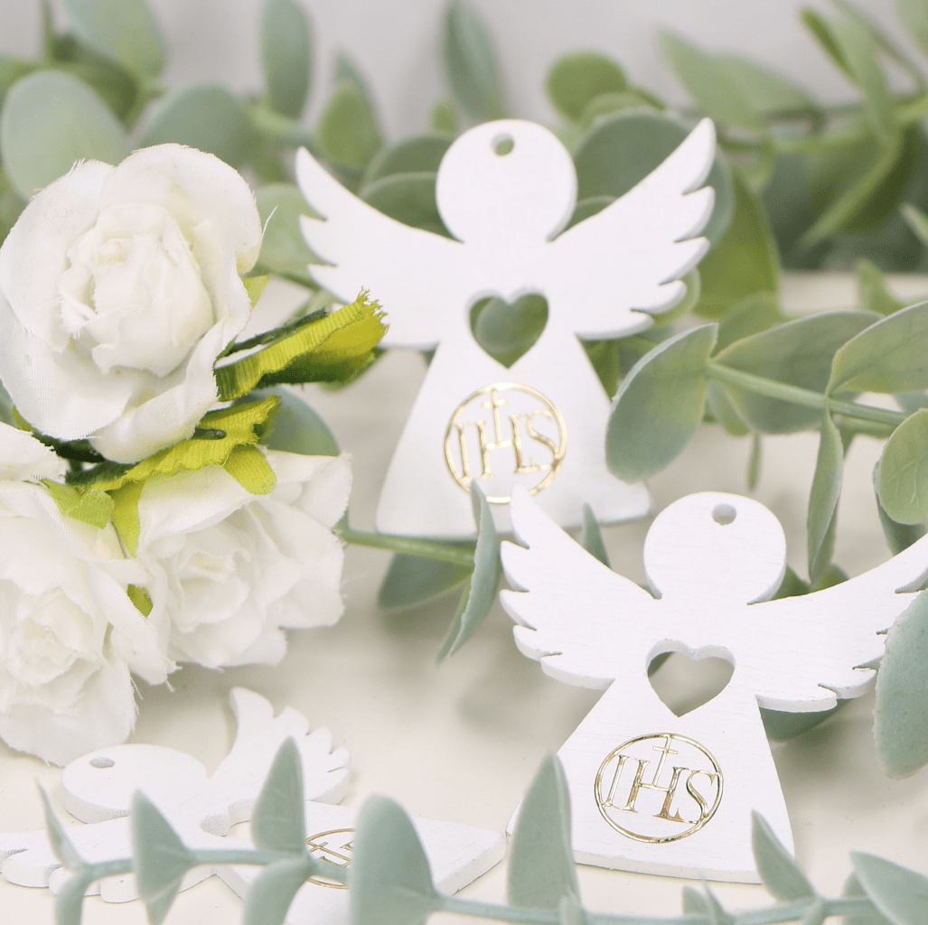 Drewniany aniołek biały podziękowania IHS komunia chrzest 5cm 5szt