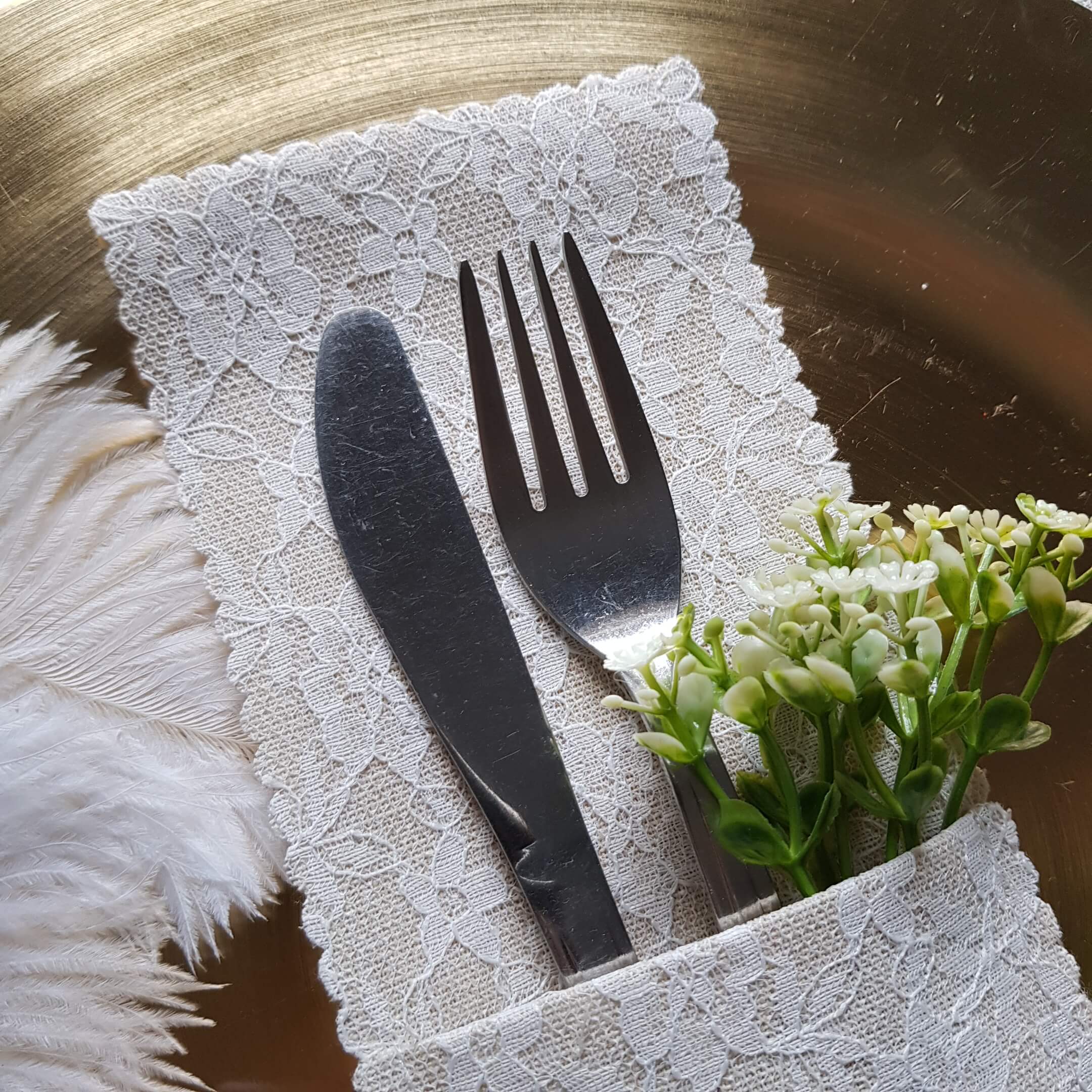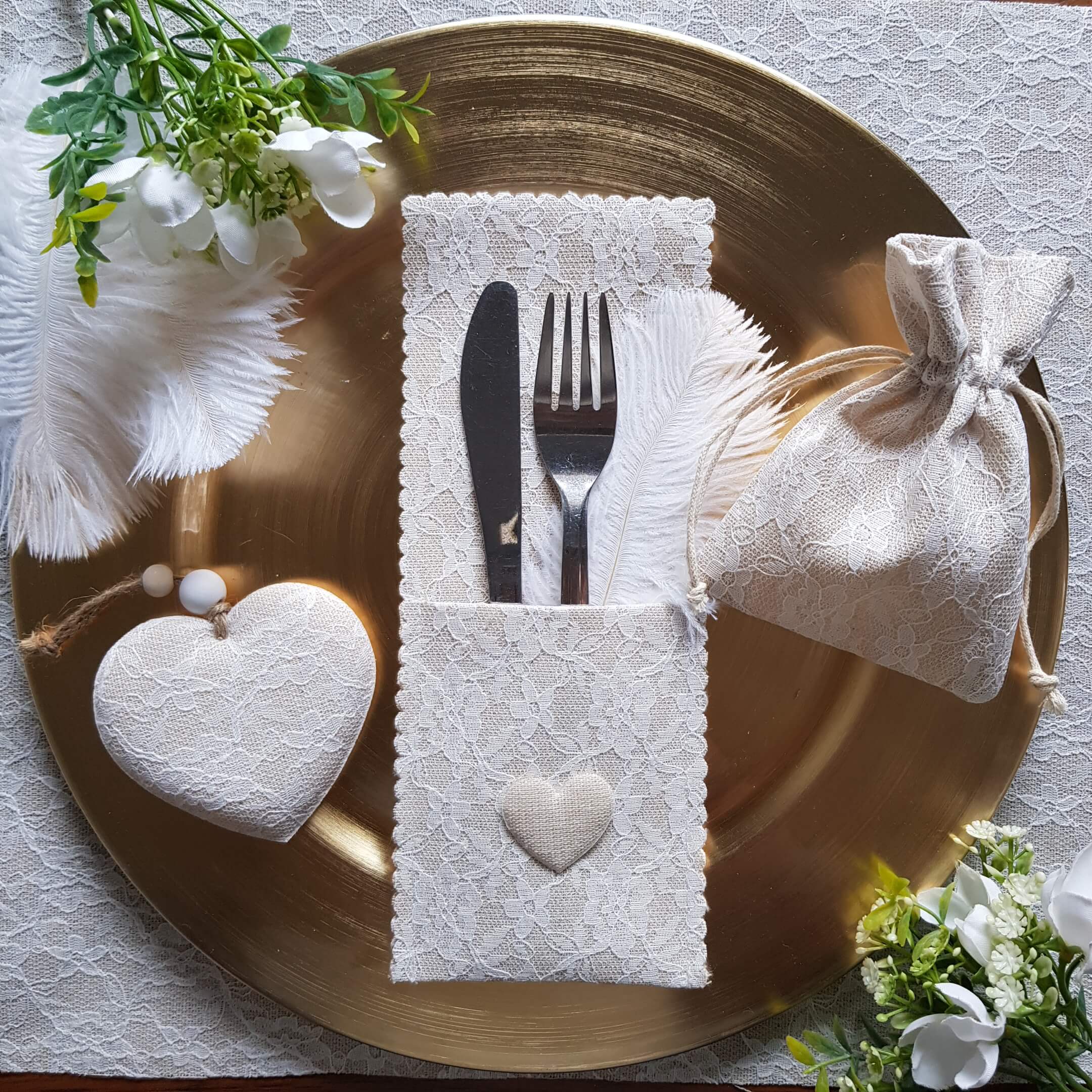 Piękne etui w delikatnych kolorach, obszyte koronką wykonane zostały z wielką starannością. Świetnie nadają się do aranżacji stołu w stylu boho jak i do stylu bardziej klasycznego, dzięki ich prostej formie.