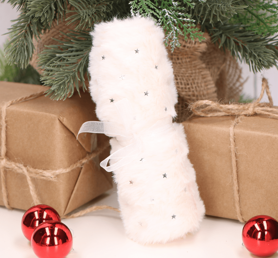 Świetnym pomysłem na świąteczną aranżację, która oczaruje wszystkich gości będzie aksamitny futerkowy bieżnik pokryty srebrnymi gwiazdkami. Bieżnik to idealny pomysł na prezent, ponieważ jest związany elegancką wstążeczką i gotowy do wręczenia.
