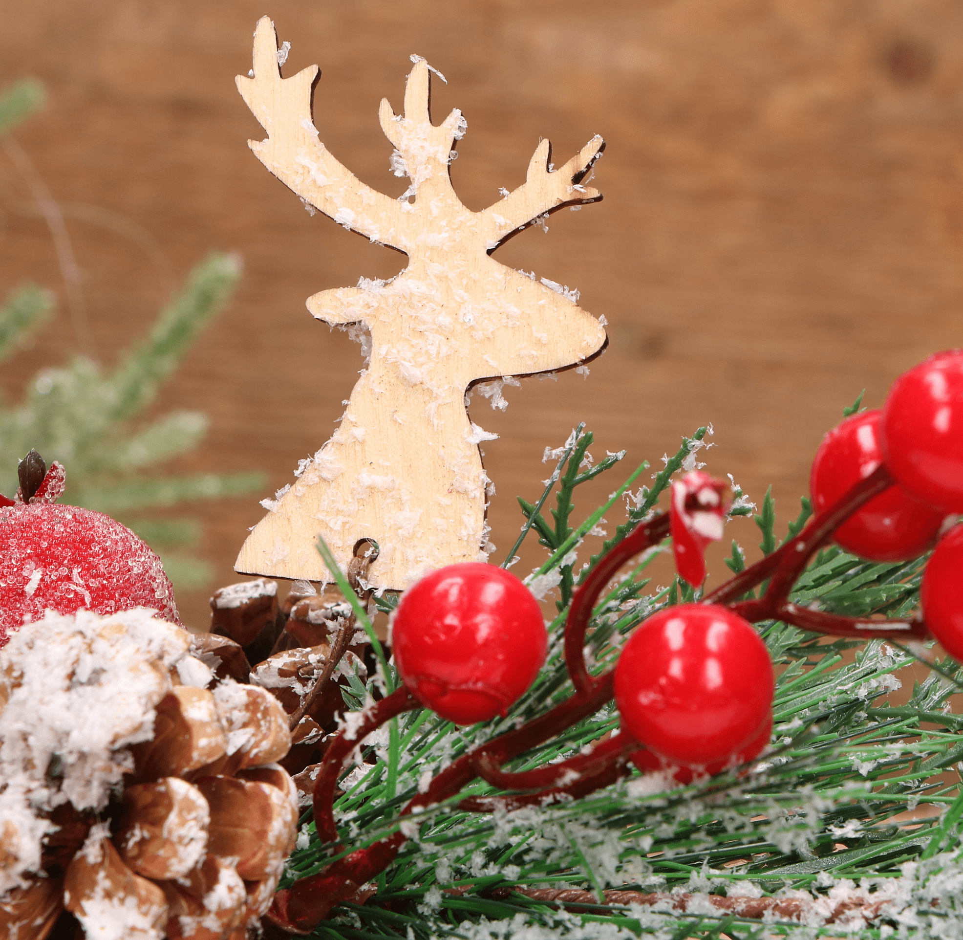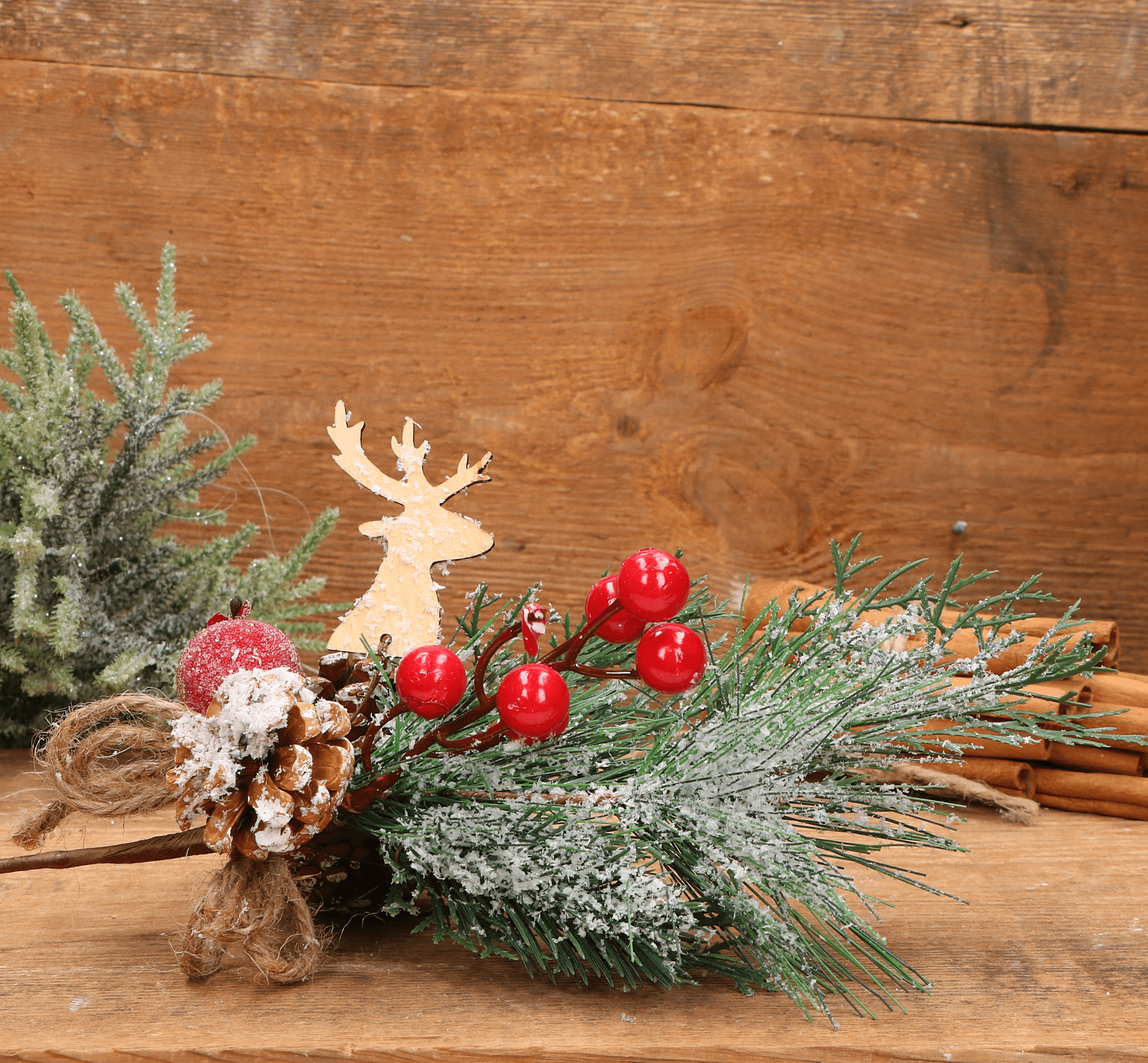 Gałązka dekoracyjna świąteczna z jarzębinką, szyszką i reniferem 38cm