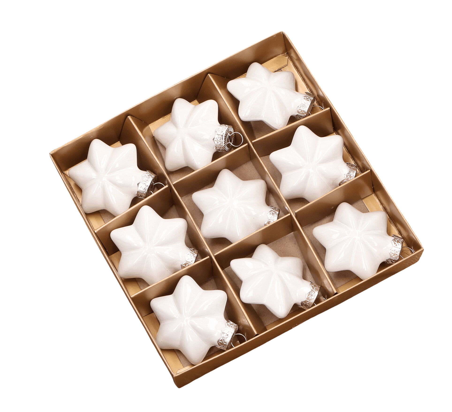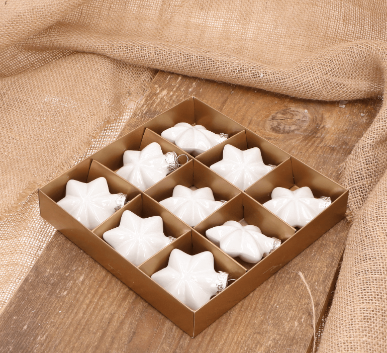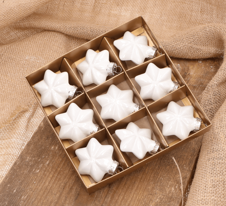 Gwiazdka szklana biała opalizująca6,5cm- 9 sztuk w złotym opakowaniu