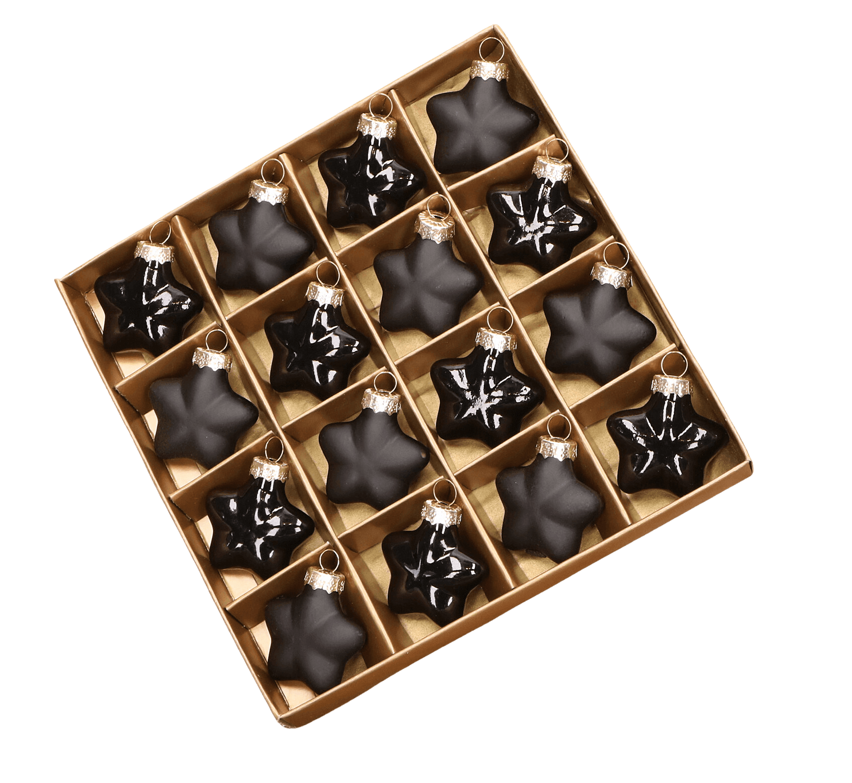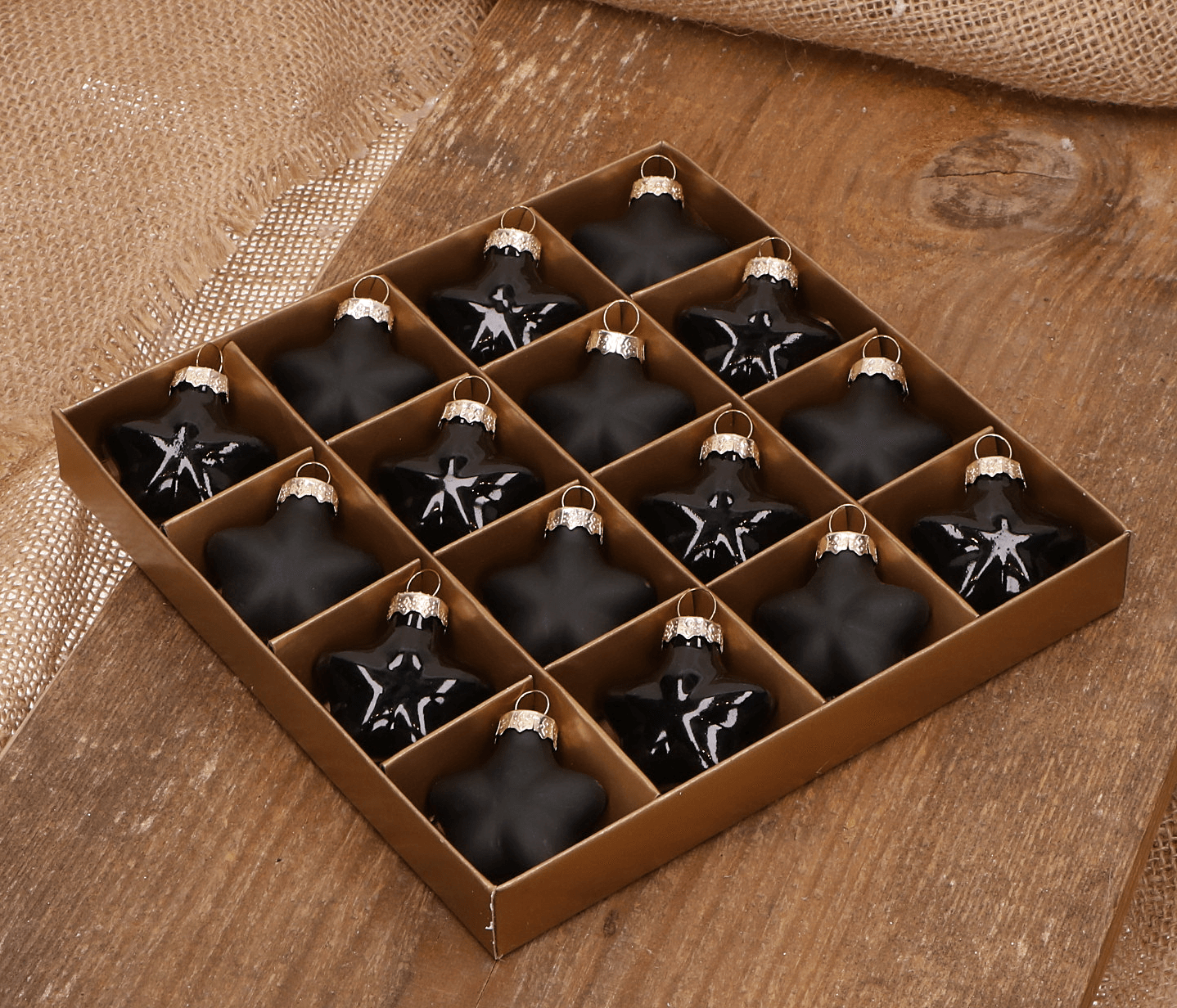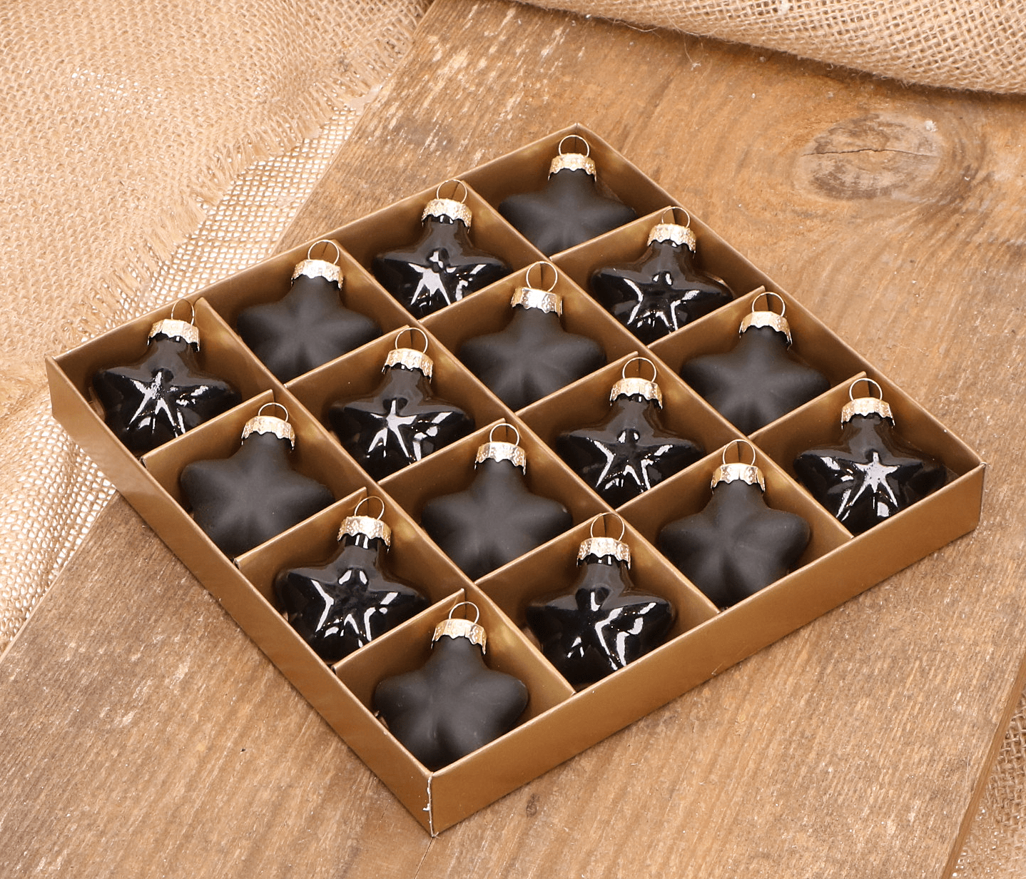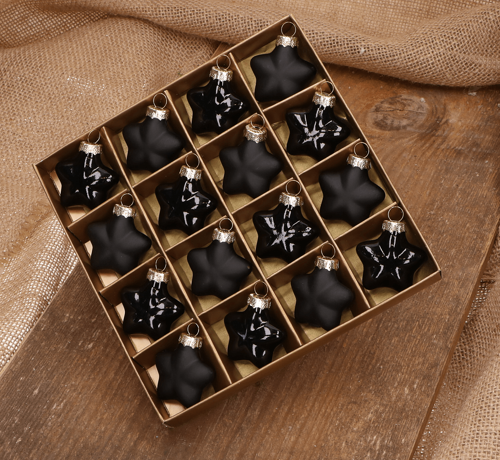 Gwiazdka szklana czarna 4cm- 16 sztuk w złotym opakowaniu