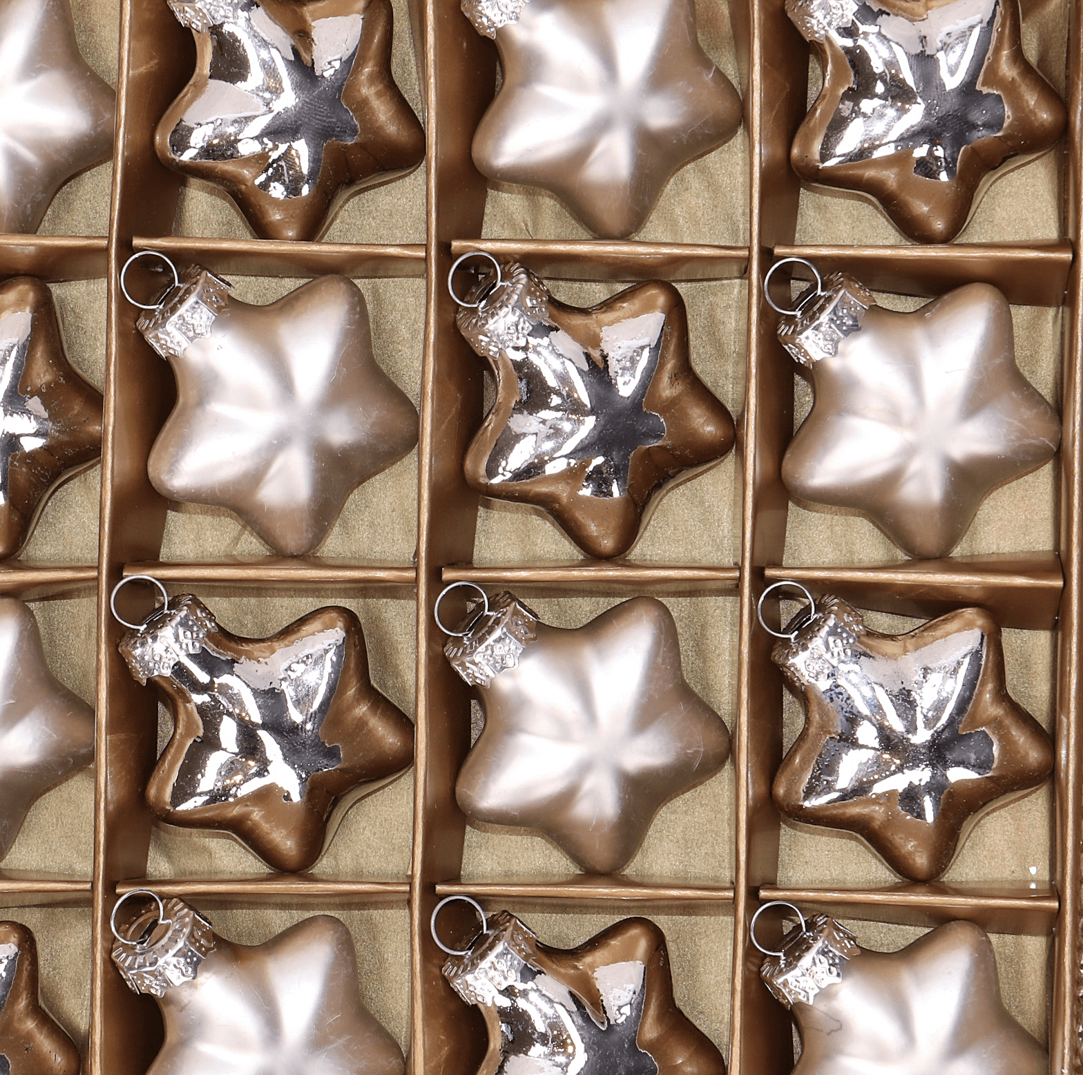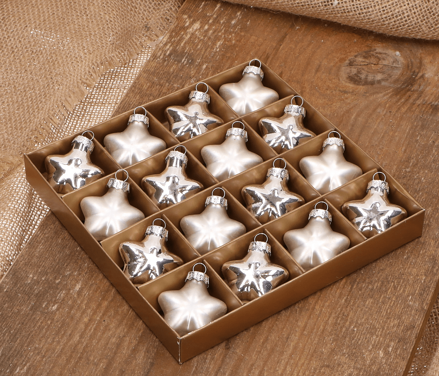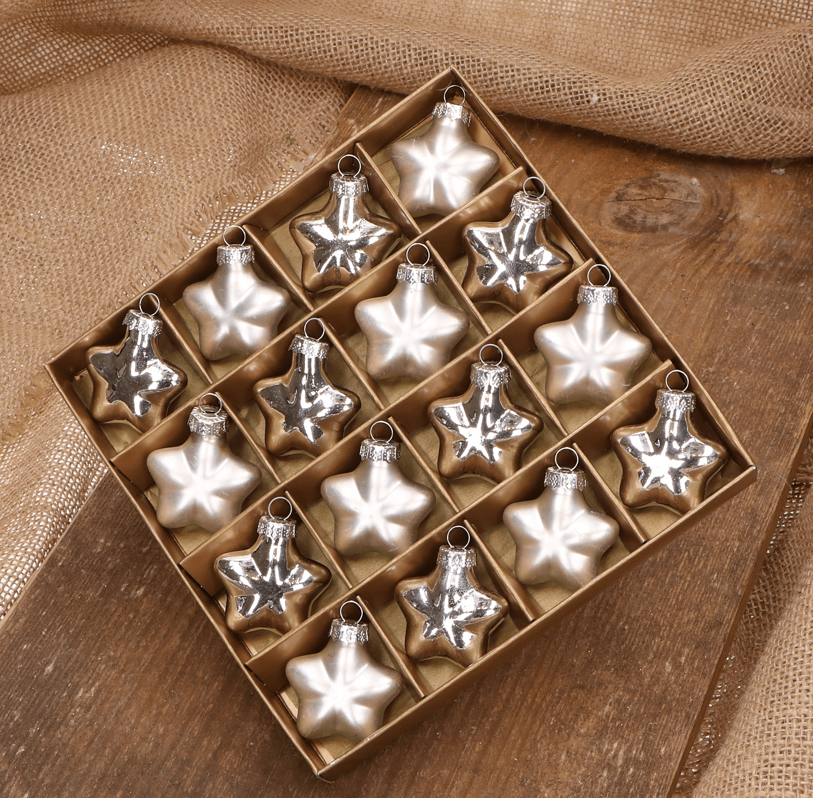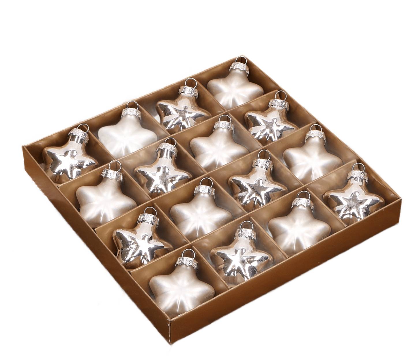 Gwiazdka szklana srebrna 4cm- 16 sztuk w złotym opakowaniu