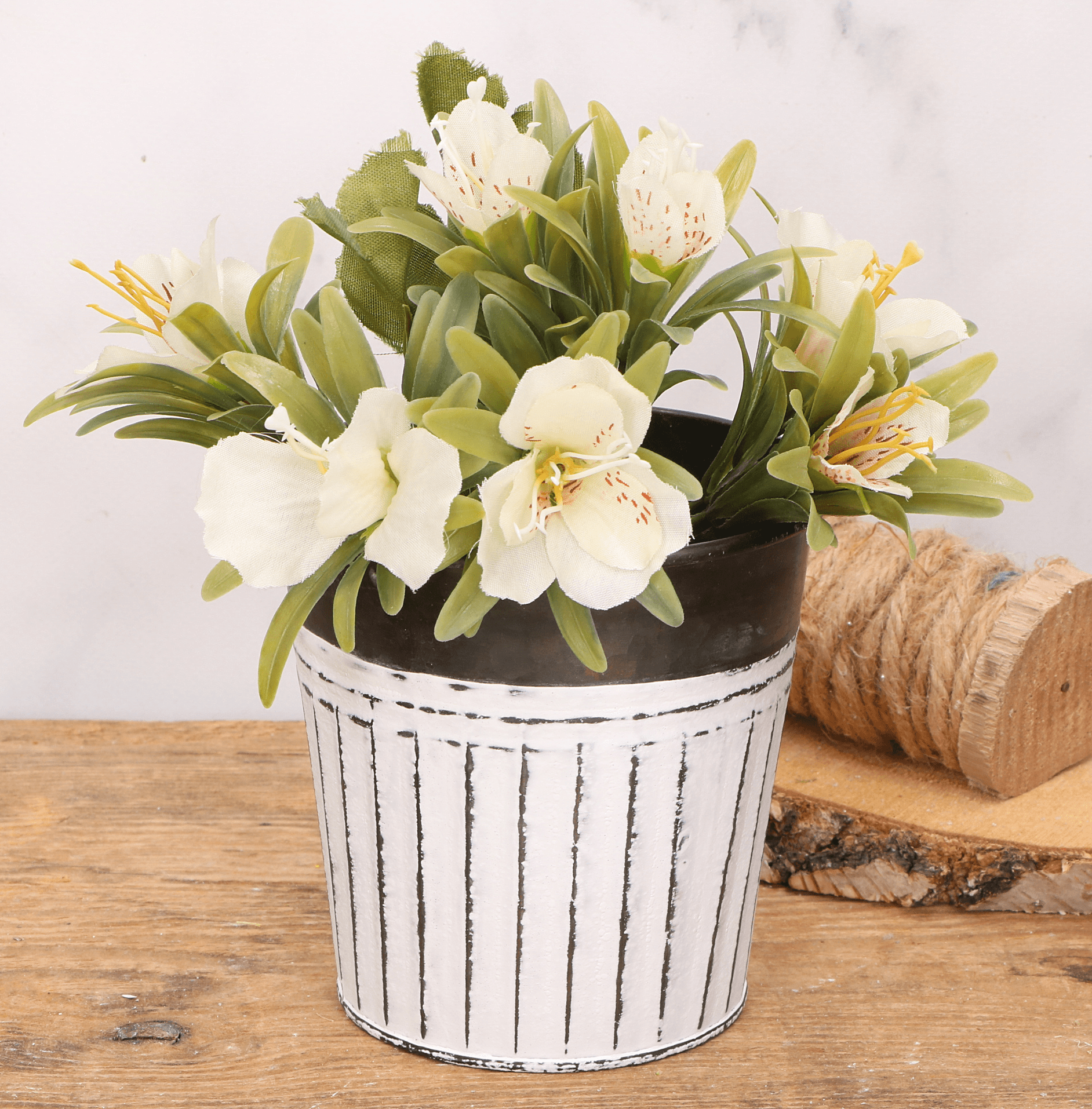 Osłonka doniczka metalowa szaro-biała w paski 10,5cm