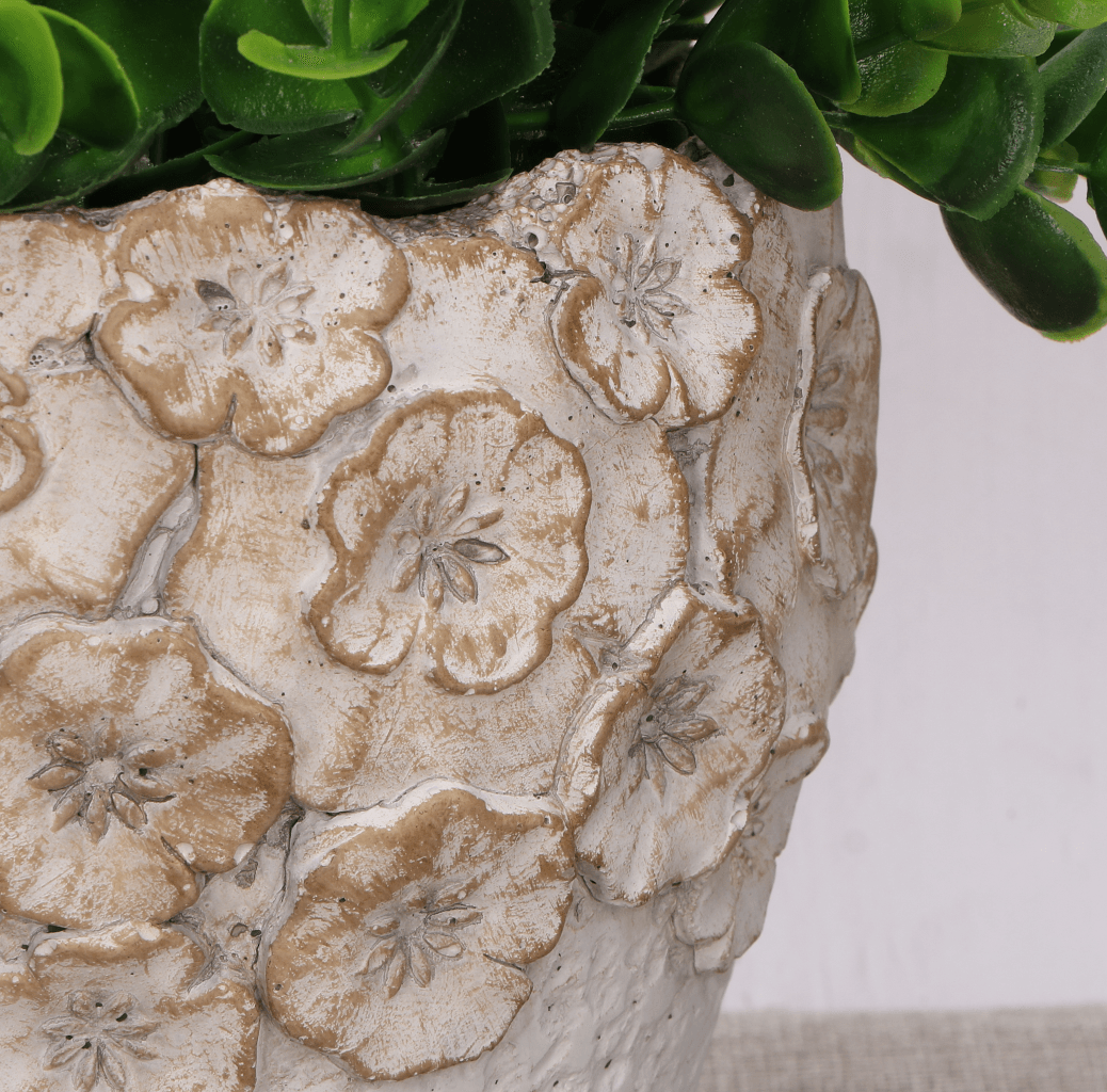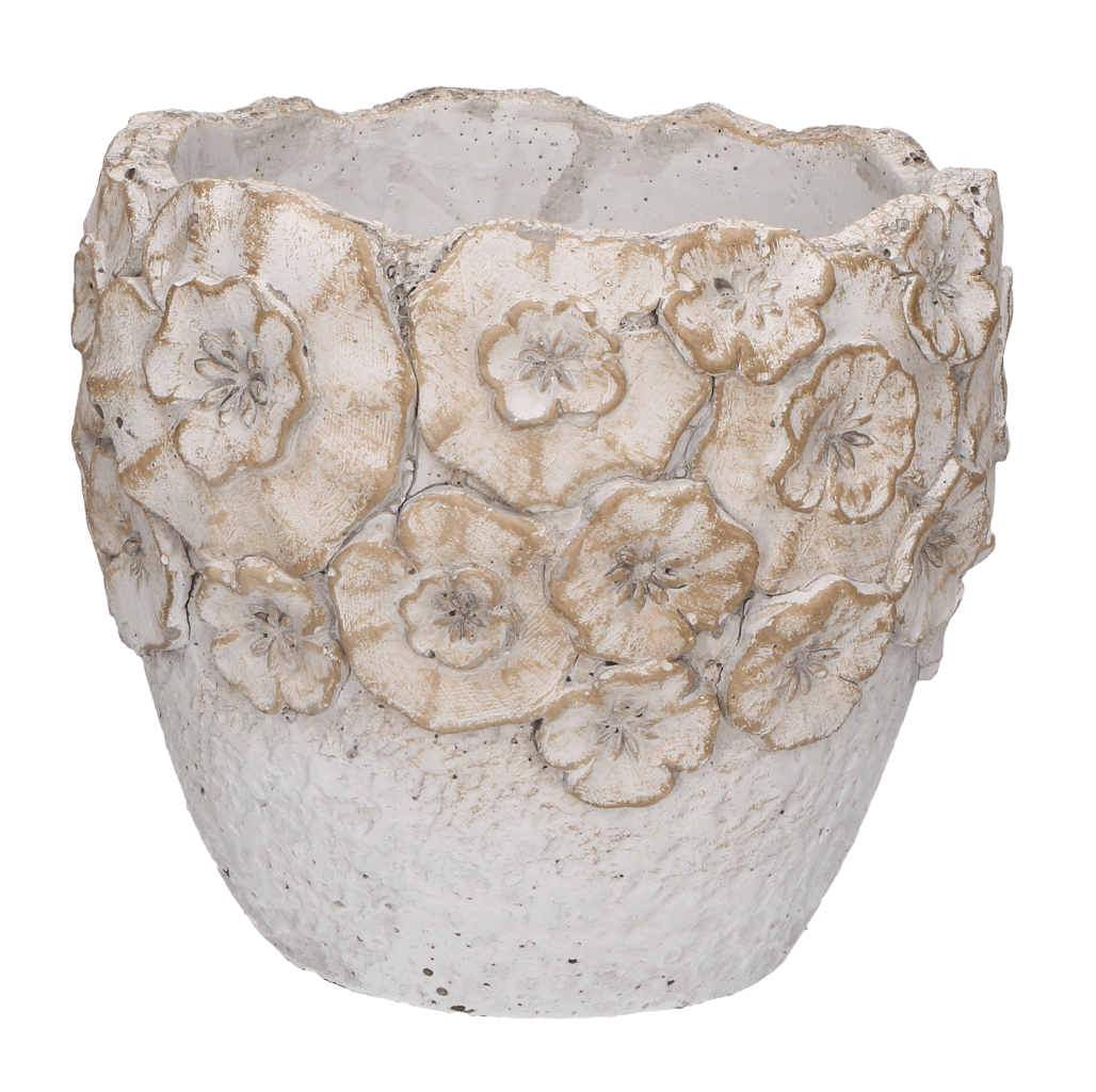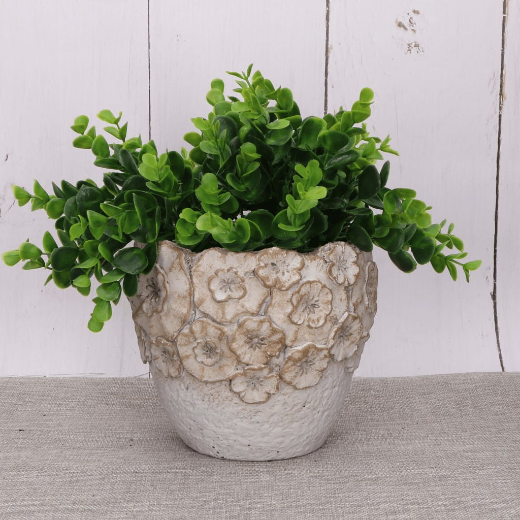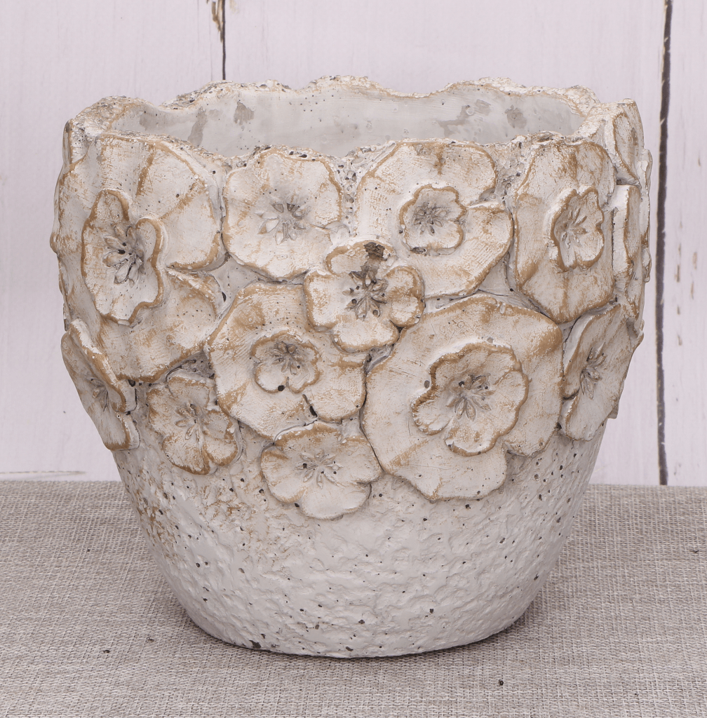 Osłonka kamienna z cementu z kwiatami okrągła 14 cm