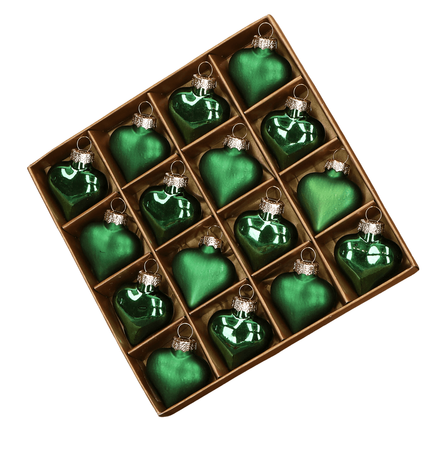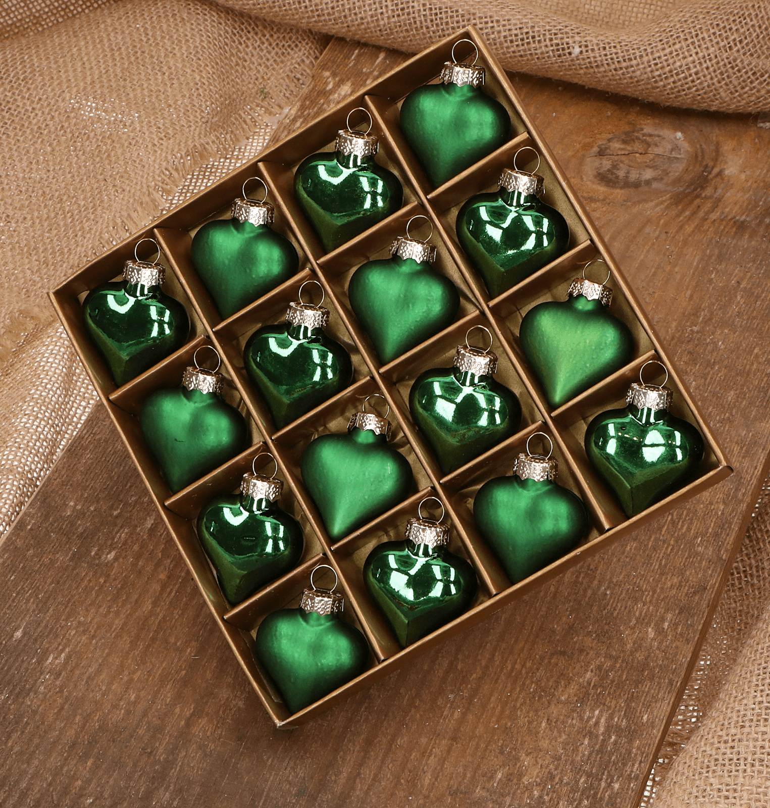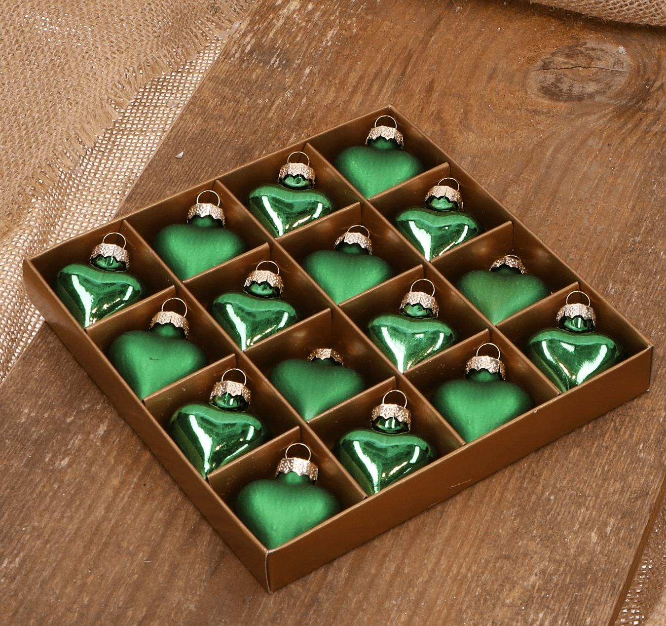 Piękne szklane bombki w kształcie serca w zielonym kolorze to doskonały dodatek do każdej świątecznej choinki. Zestaw zawiera 16 sztuk starannie zapakowanych w eleganckie, złote opakowanie, co sprawia, że jest to również świetny pomysł na prezent. Zielone bombki w matowym i błyszczącym wykończeniu tworzą harmonijną i stylową dekorację, doskonale pasującą do klasycznych i nowoczesnych aranżacji. Dzięki solidnemu wykonaniu oraz uniwersalnemu designowi, te bombki dodadzą Twojej choince wyjątkowego blasku i elegancji.