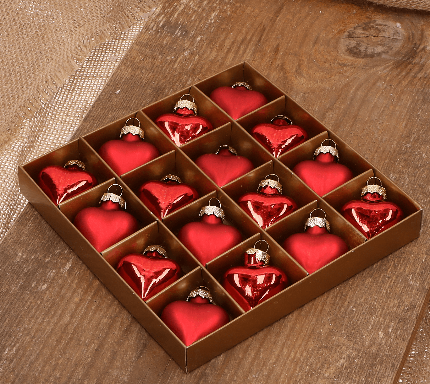 Serduszko szklane czerwone 4cm- 16 sztuk w złotym opakowaniu