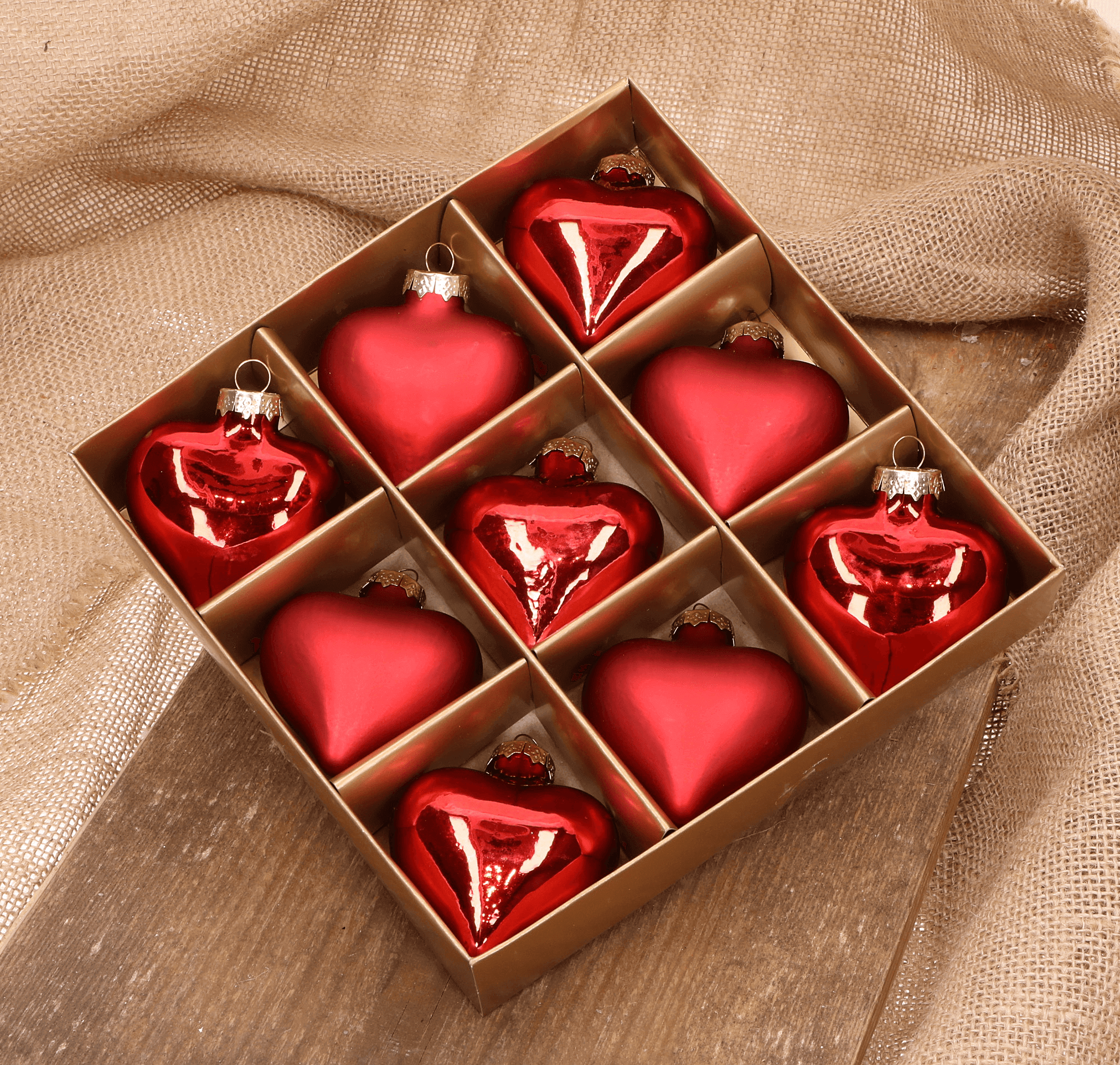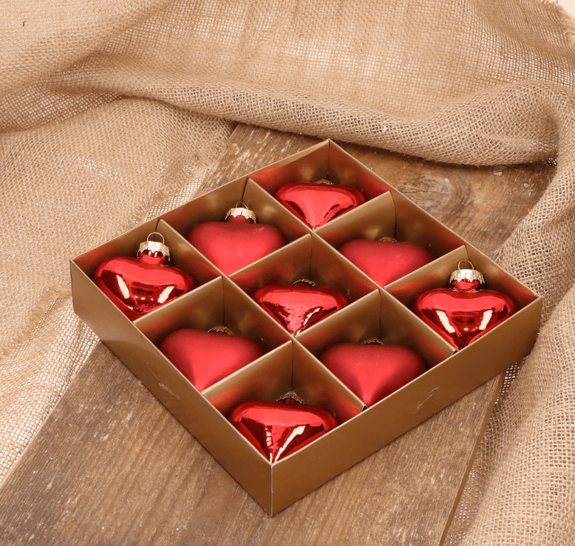 Serduszko szklane czerwone 6,5cm- 9 sztuk w złotym opakowaniu