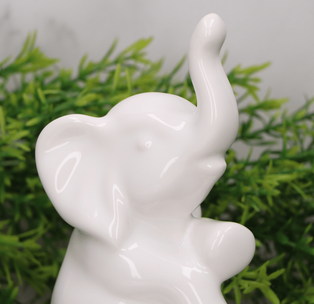 Słoń "siedzący okrakiem" szkliwiony biały 14cm