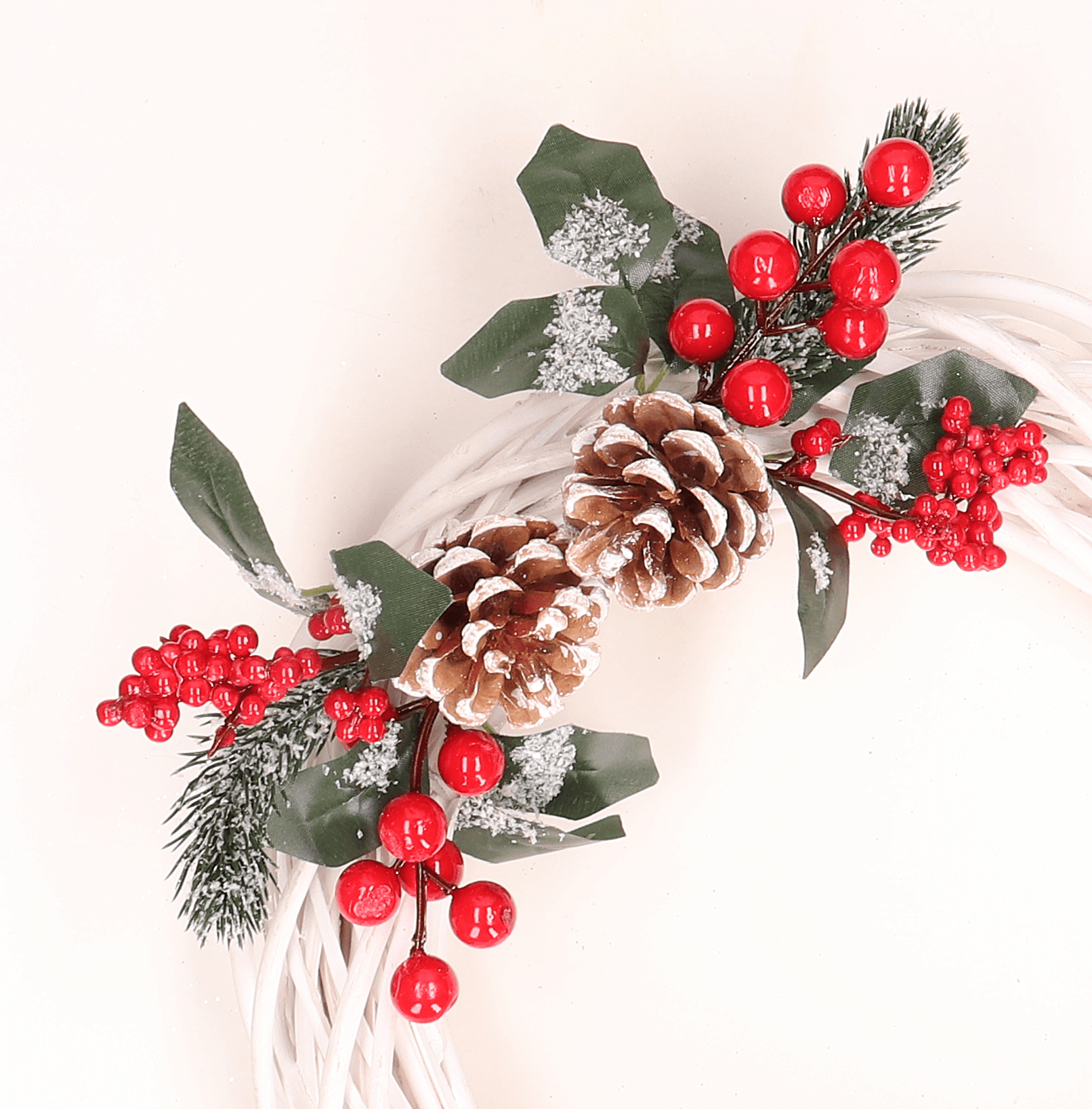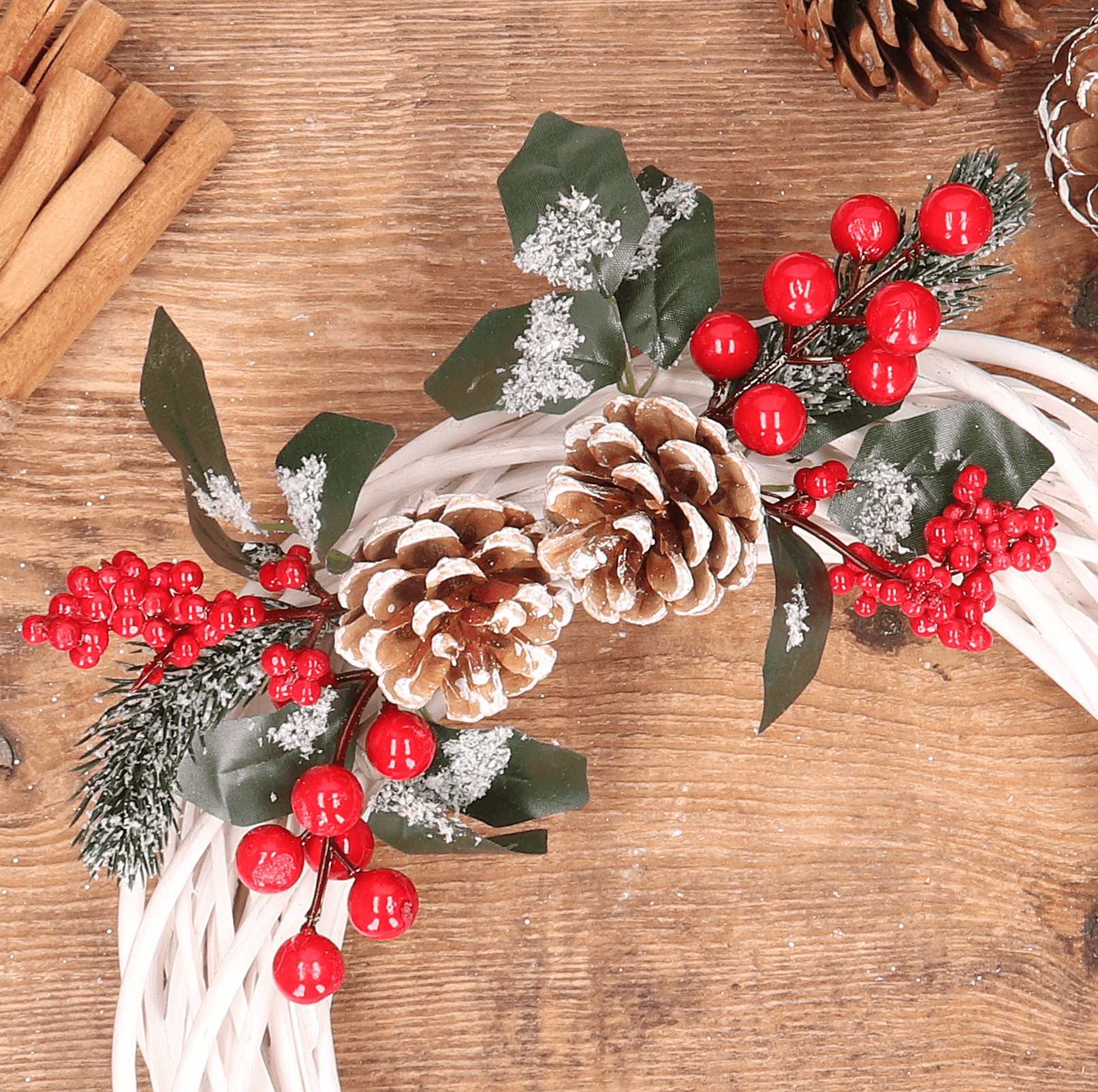 - Każda gałązka jest ozdobiona piękną jarzębiną i szyszką, co nadaje jej uroku i świątecznego charakteru.