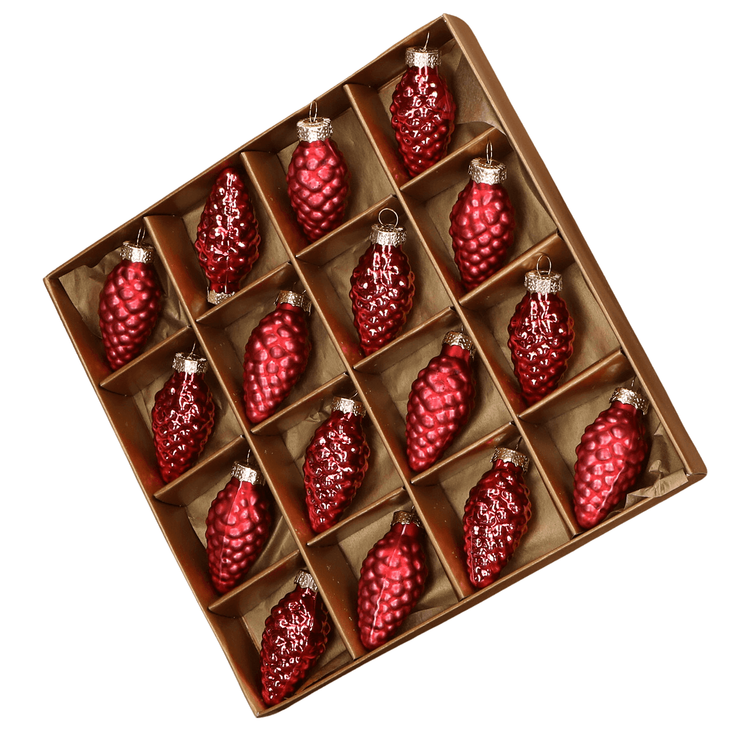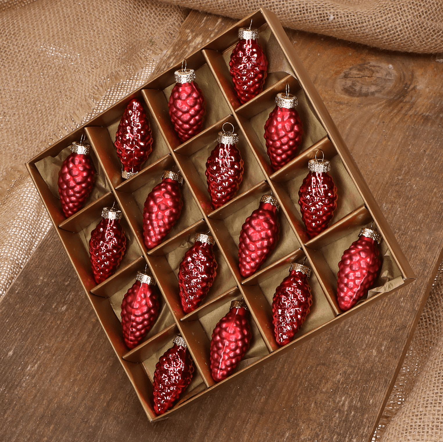 Zestaw 16 szklanych bombek w kształcie szyszek, w klasycznym czerwonym kolorze, to idealna ozdoba na choinkę, która wprowadzi ciepły, świąteczny klimat. Bombki wyróżniają się błyszczącym i matowym wykończeniem, które pięknie odbija światło i dodaje głębi dekoracjom. Wykonane z wysokiej jakości szkła, bombki są trwałe i odporne na zniszczenia. Zapakowane w eleganckie złote pudełko, bombki idealnie nadają się na prezent lub do bezpiecznego przechowywania po świętach. Ten zestaw doskonale uzupełni zarówno tradycyjne, jak i nowoczesne dekoracje świąteczne.