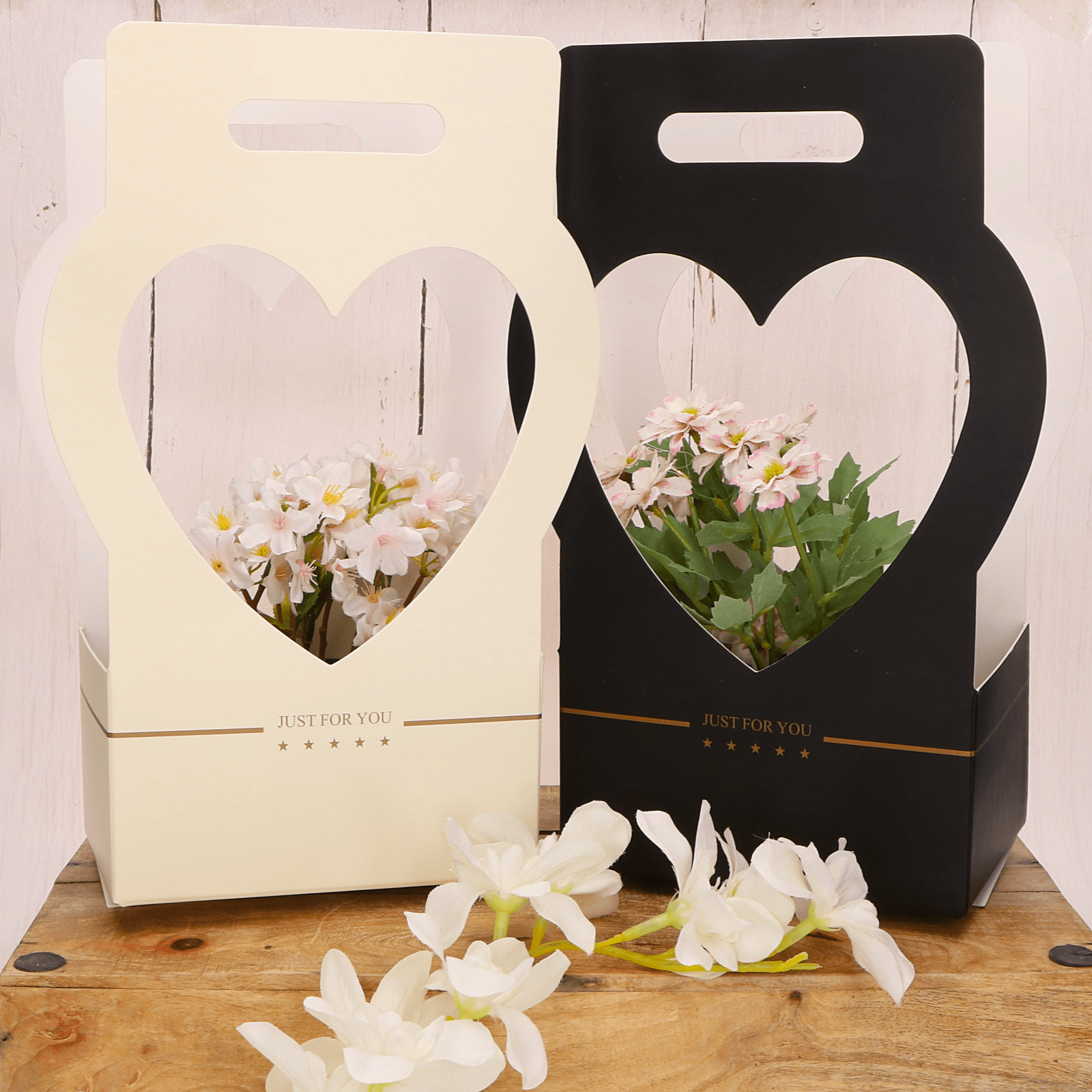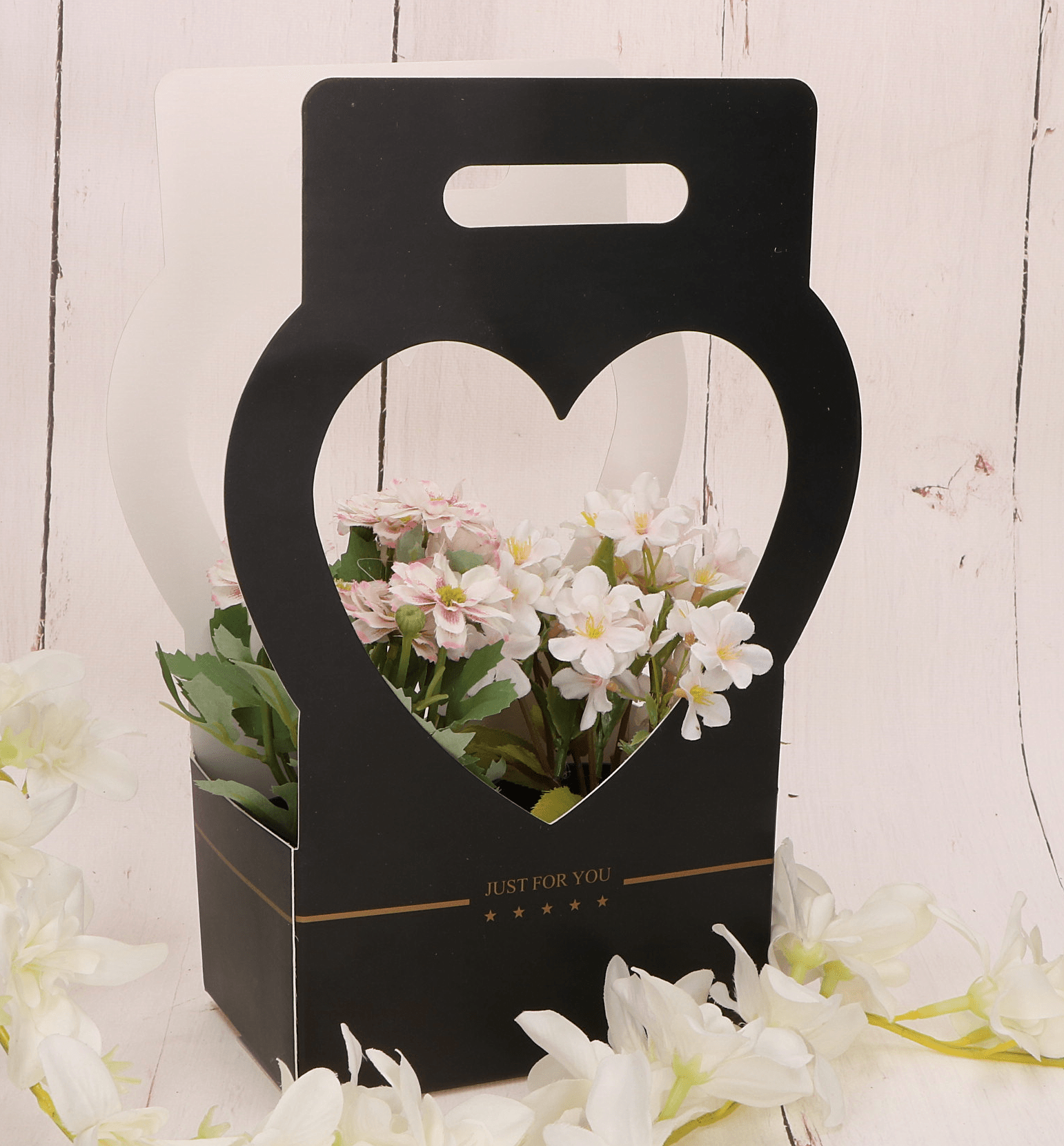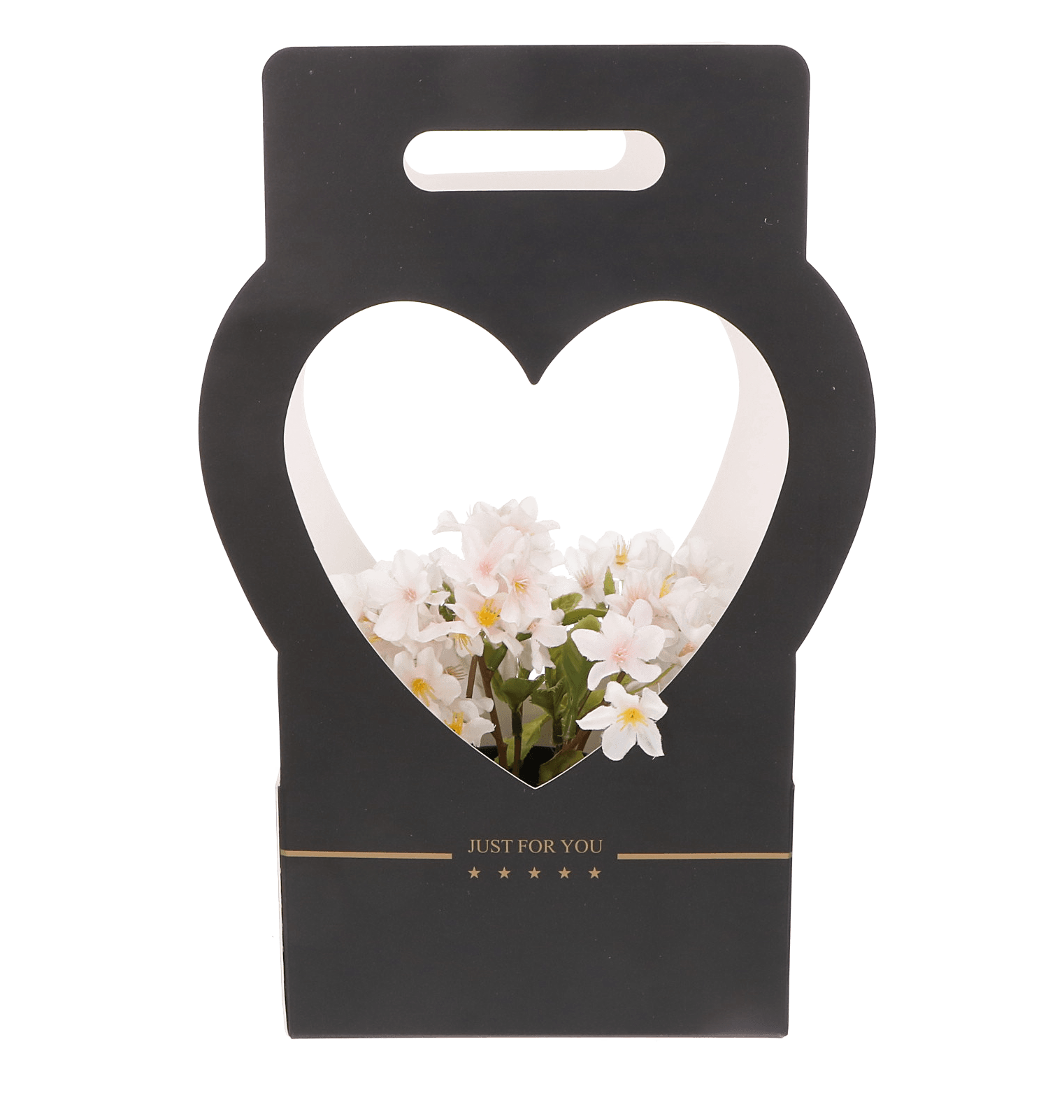 Ta czarna torebka na kwiaty z romantycznym wycięciem w kształcie serca to wyjątkowy sposób na zaprezentowanie bukietu. Eleganckie wykończenie i napis "Just for you" dodają osobistego charakteru i uczynią każdy prezent jeszcze bardziej wyjątkowym. Praktyczny uchwyt ułatwia noszenie, a kreatywny design czyni ją idealnym wyborem na specjalne okazje.
