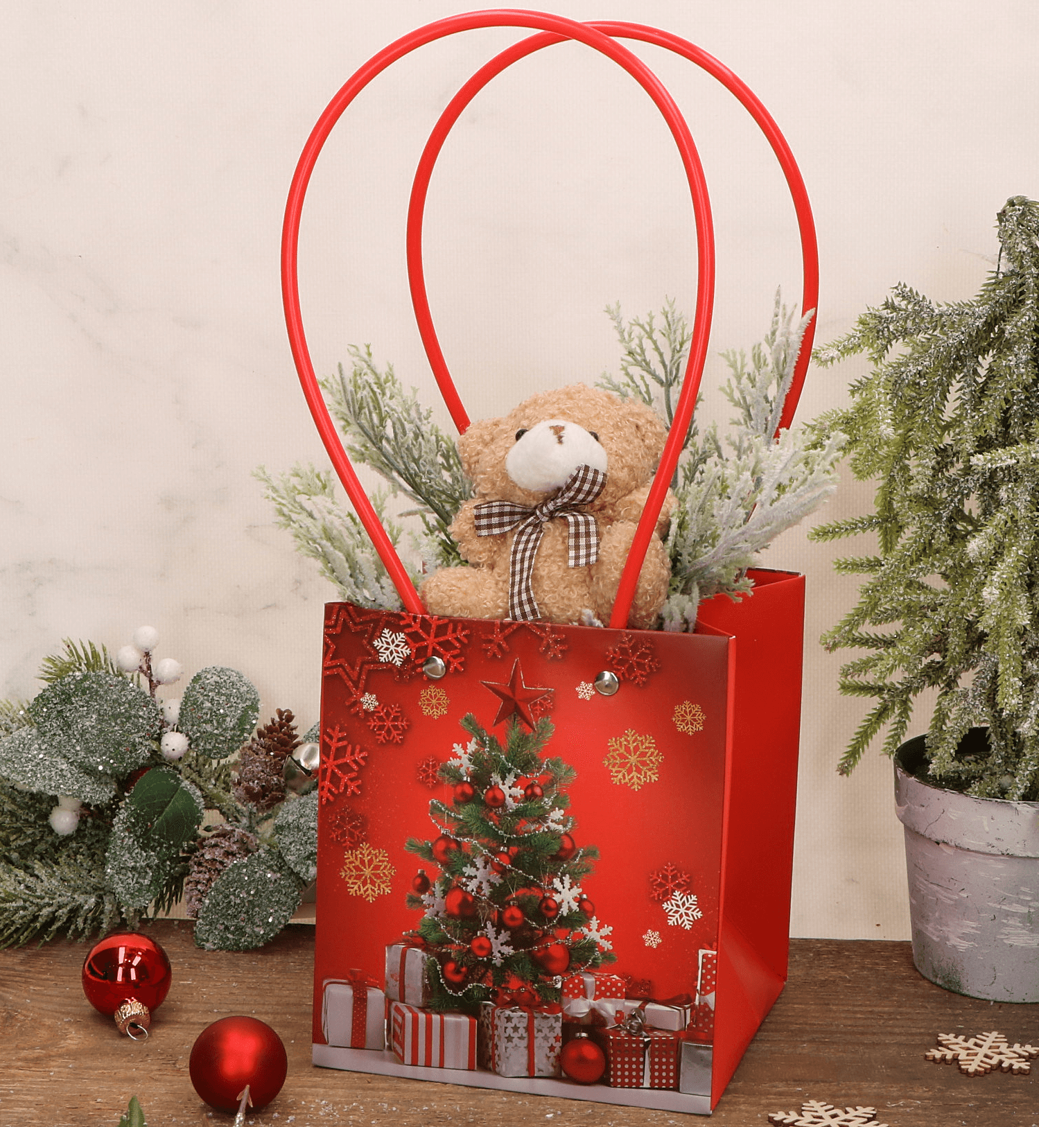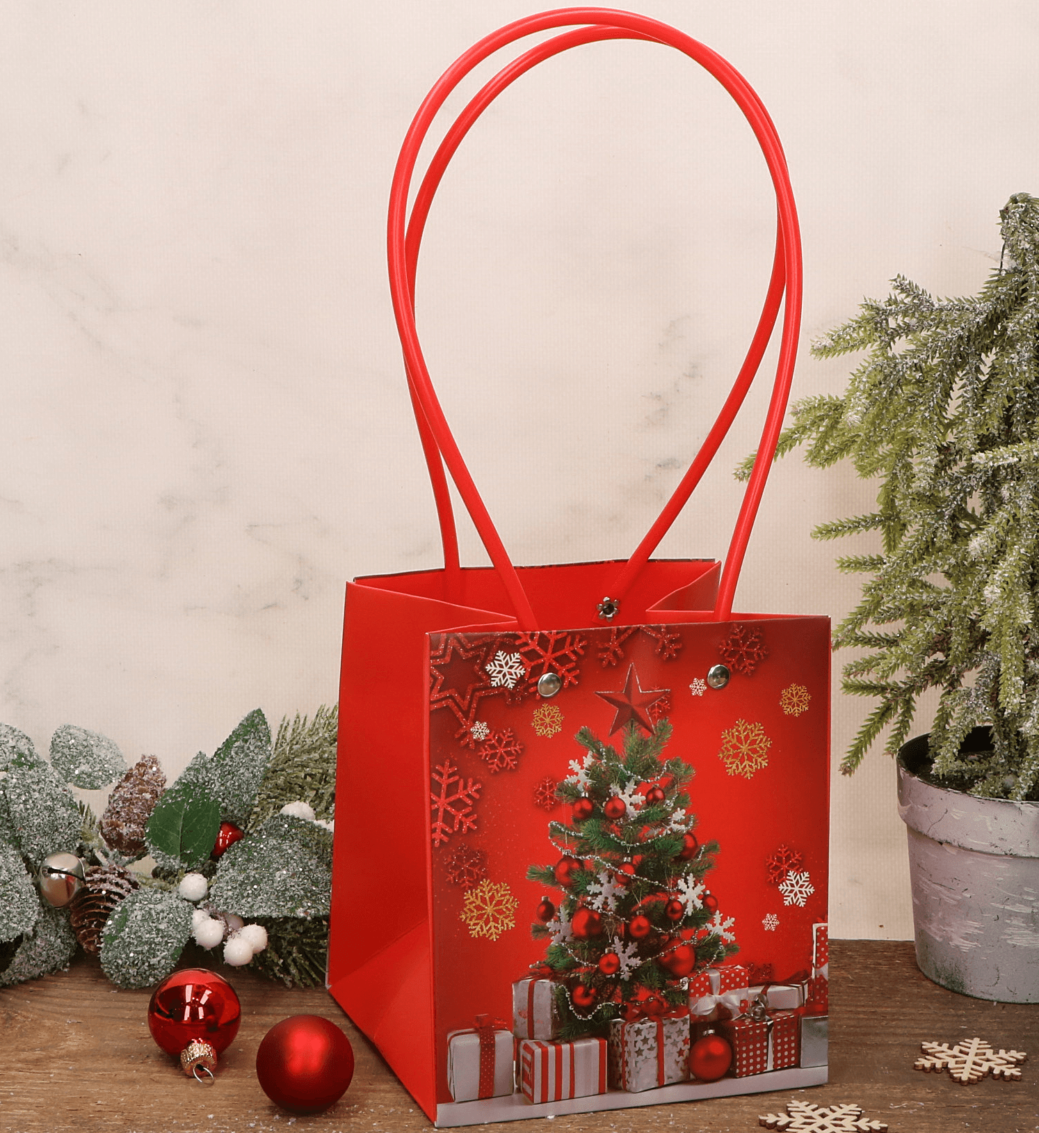Elegancka torebka na kwiaty i prezenty z uroczym świątecznym motywem to idealne rozwiązanie na efektowne zapakowanie upominków. Wyposażona w czerwony uchwyt, który ułatwia przenoszenie, jest zarówno praktyczna, jak i stylowa. Doskonale nadaje się do wręczania drobnych prezentów, kwiatów lub słodyczy, wprowadzając świąteczny nastrój. Solidna konstrukcja zapewnia, że zawartość pozostanie bezpieczna, a dekoracyjny wygląd sprawi, że prezent będzie wyglądał jeszcze bardziej wyjątkowo.