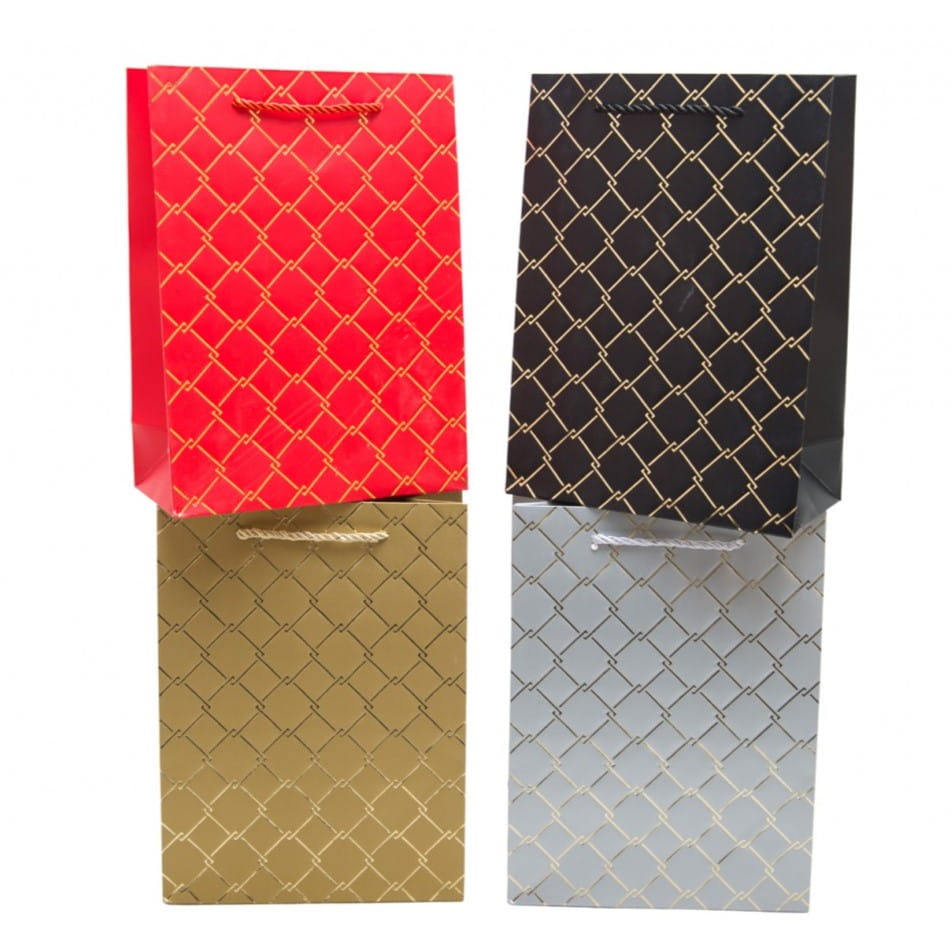 Celebrowanie wyjątkowych momentów wymaga wyjątkowej oprawy. Nasze papierowe torebki prezentowe dostępne w czterech eleganckich kolorach: czerwonym, złotym, srebrnym i czarnym, każda z nich wzbogacona o stylowy, geometryczny wzór, doskonale odzwierciedlają szyk i elegancję. Wybierz torebkę, która najlepiej pasuje do okazji i osobowości obdarowywanej osoby.