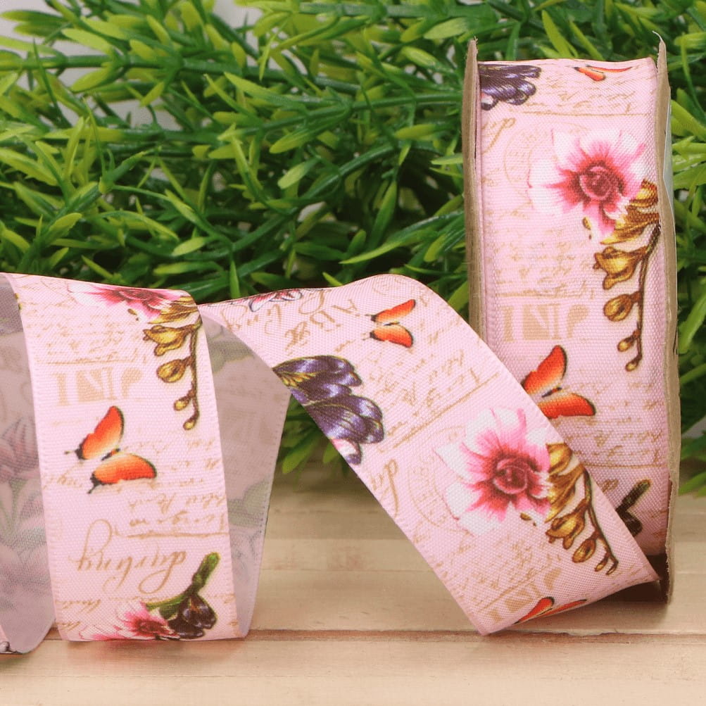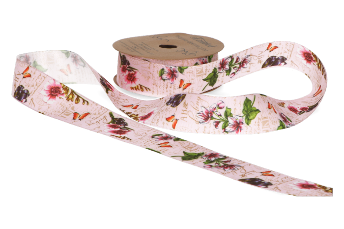 Wstążka kwiaty i motylki jasny róż 2,5cm 9m