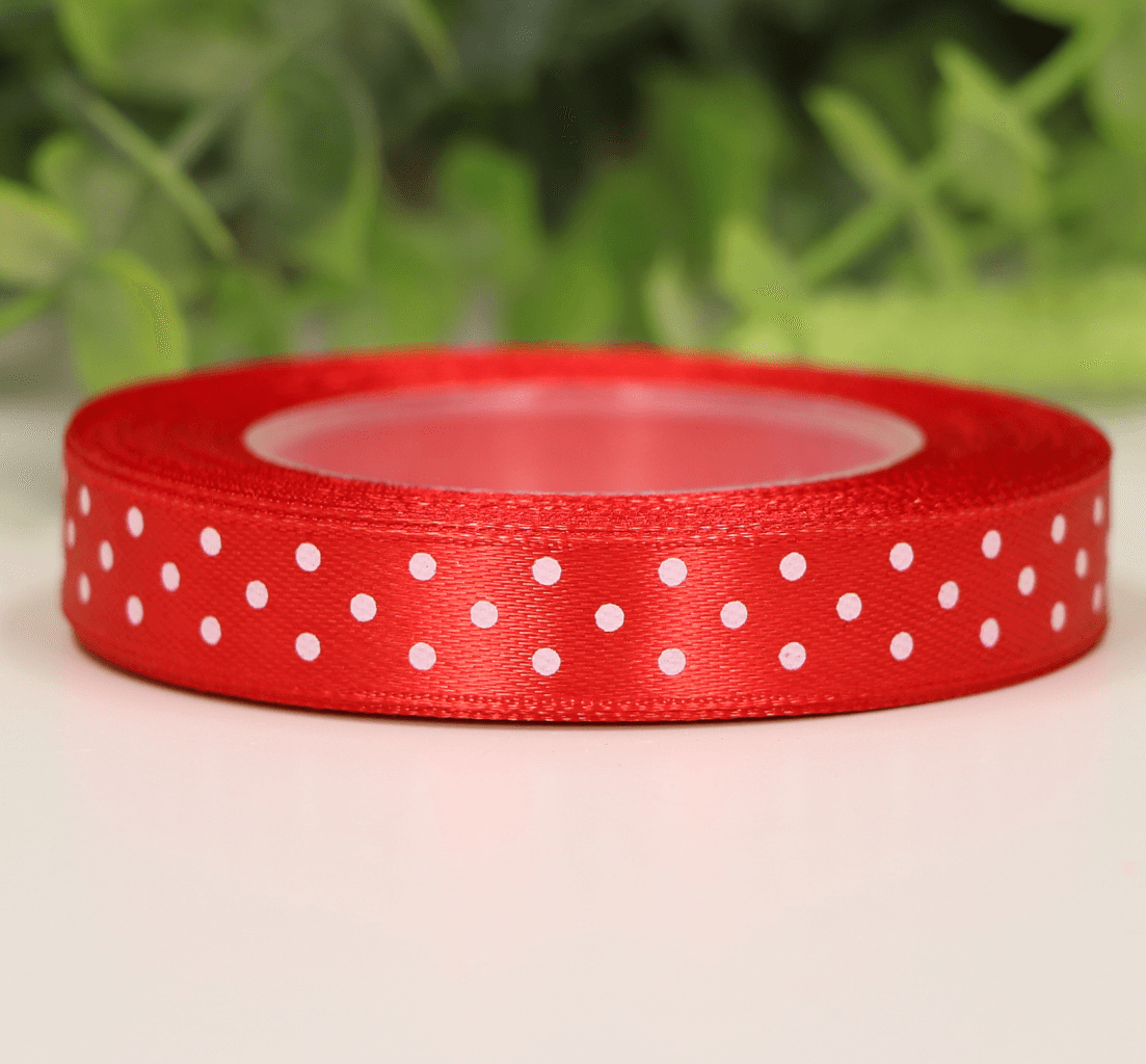 Wstążka w kropki atłasowa czerwona 1,2cm x 20Y
