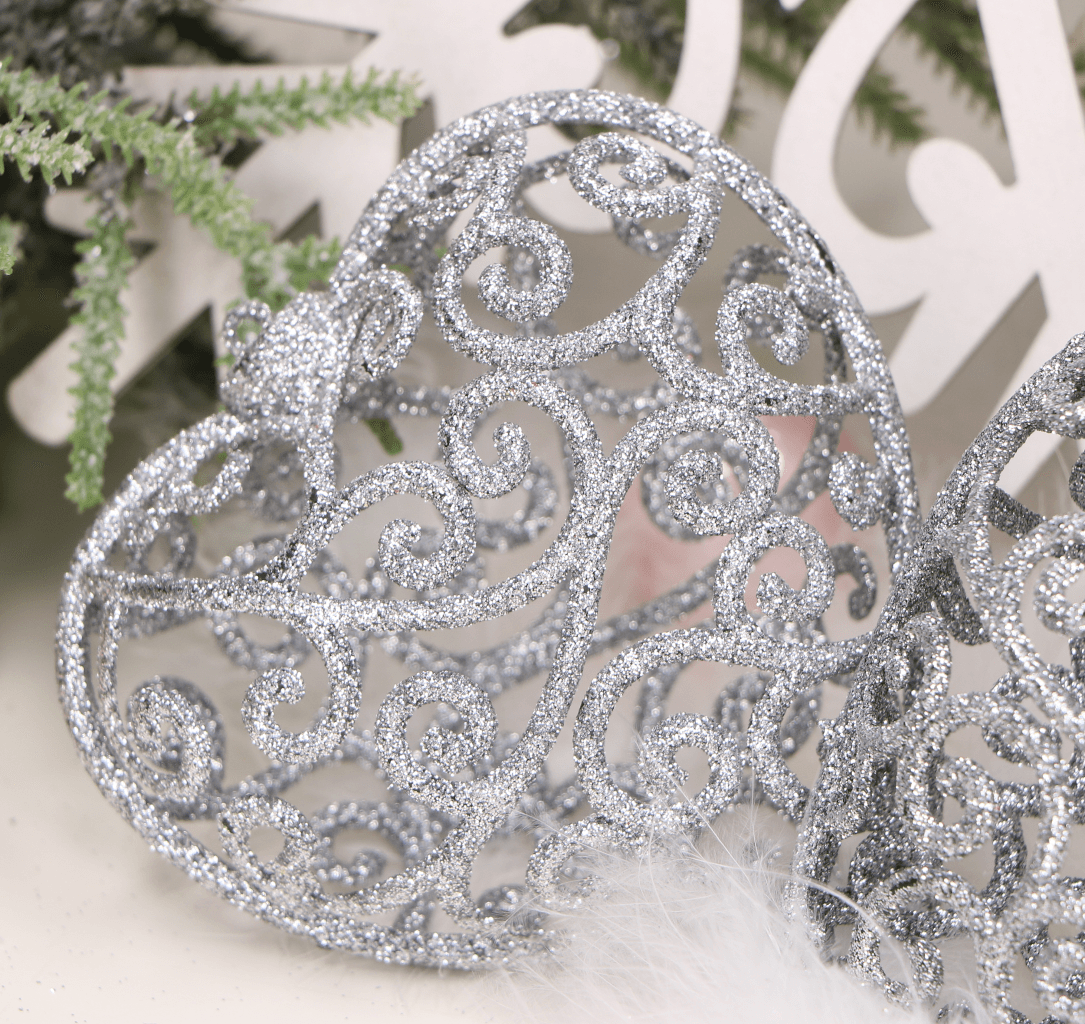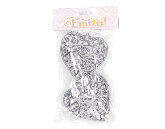Zawieszki brokatowe na choinkę plastikowe serca srebrne 2 szt.